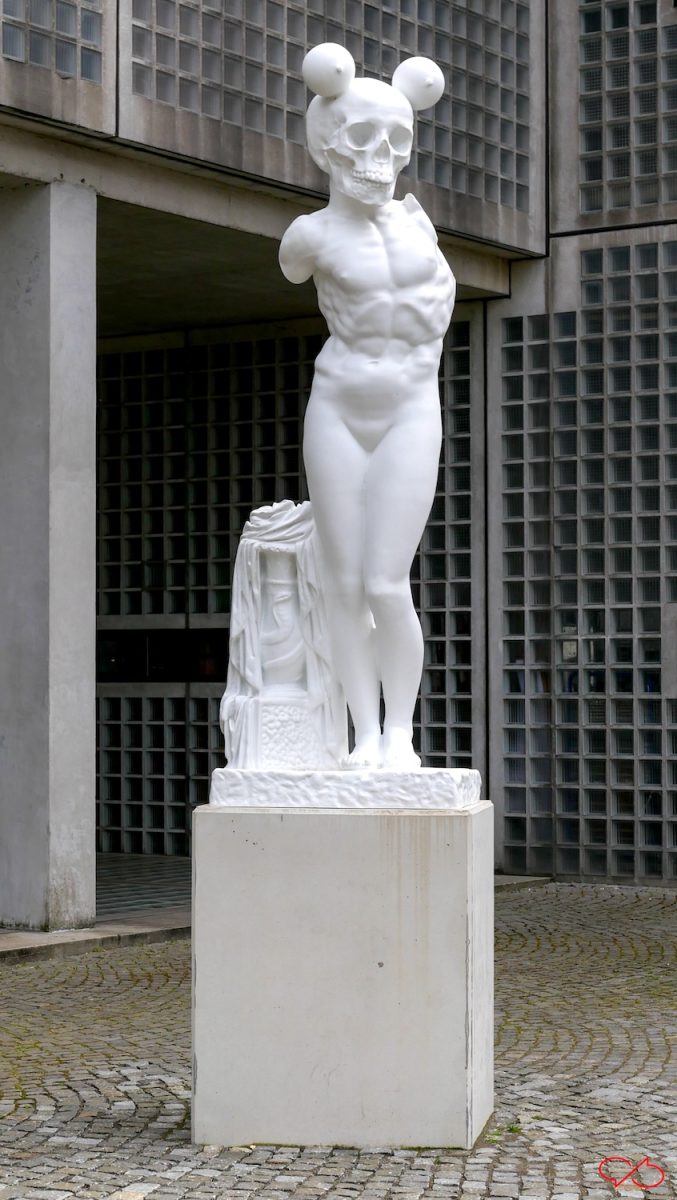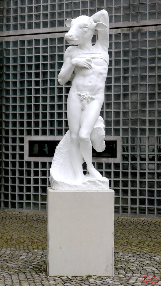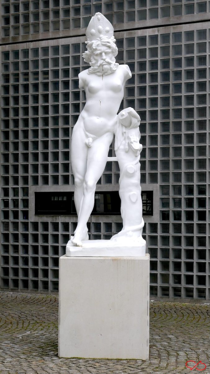 De witte beelden zijn ook van brons en staan op het Herdenkingsplein. De groep heet “Burgers van Maastricht”. Ook al zulke merkwaardige samenstellingen uit de honderden gipsen beelden die in de Academie er tegenover staan. Die beelden waren om ’te leeren teekenen’. Ik vind dit drietal prachtig contrasteren met de rechtlijnige achtergond van het academiegebouw.