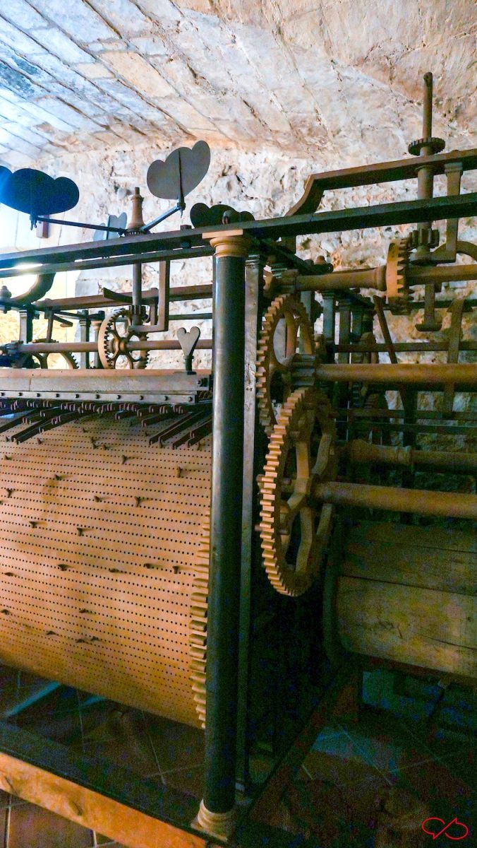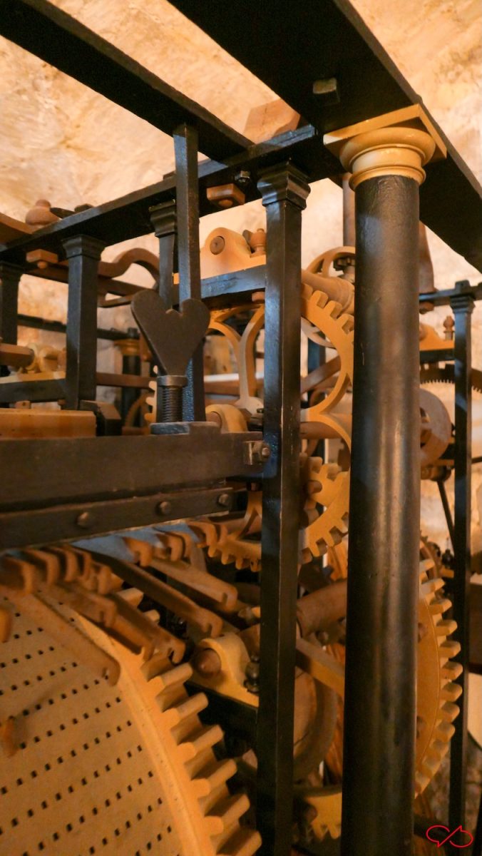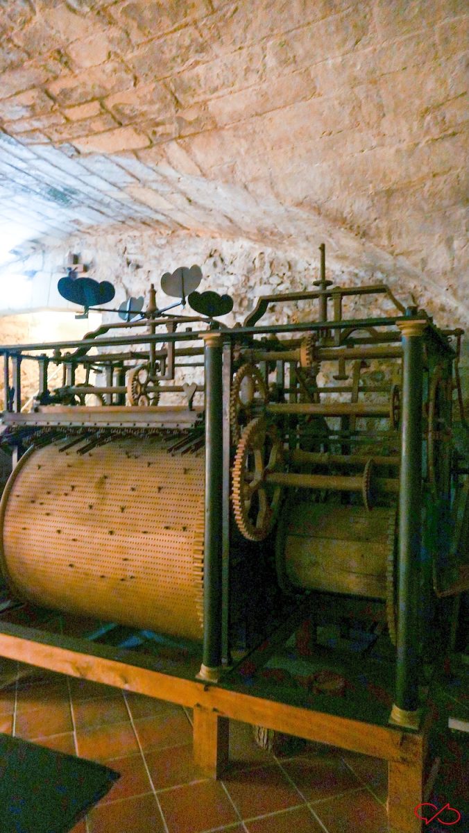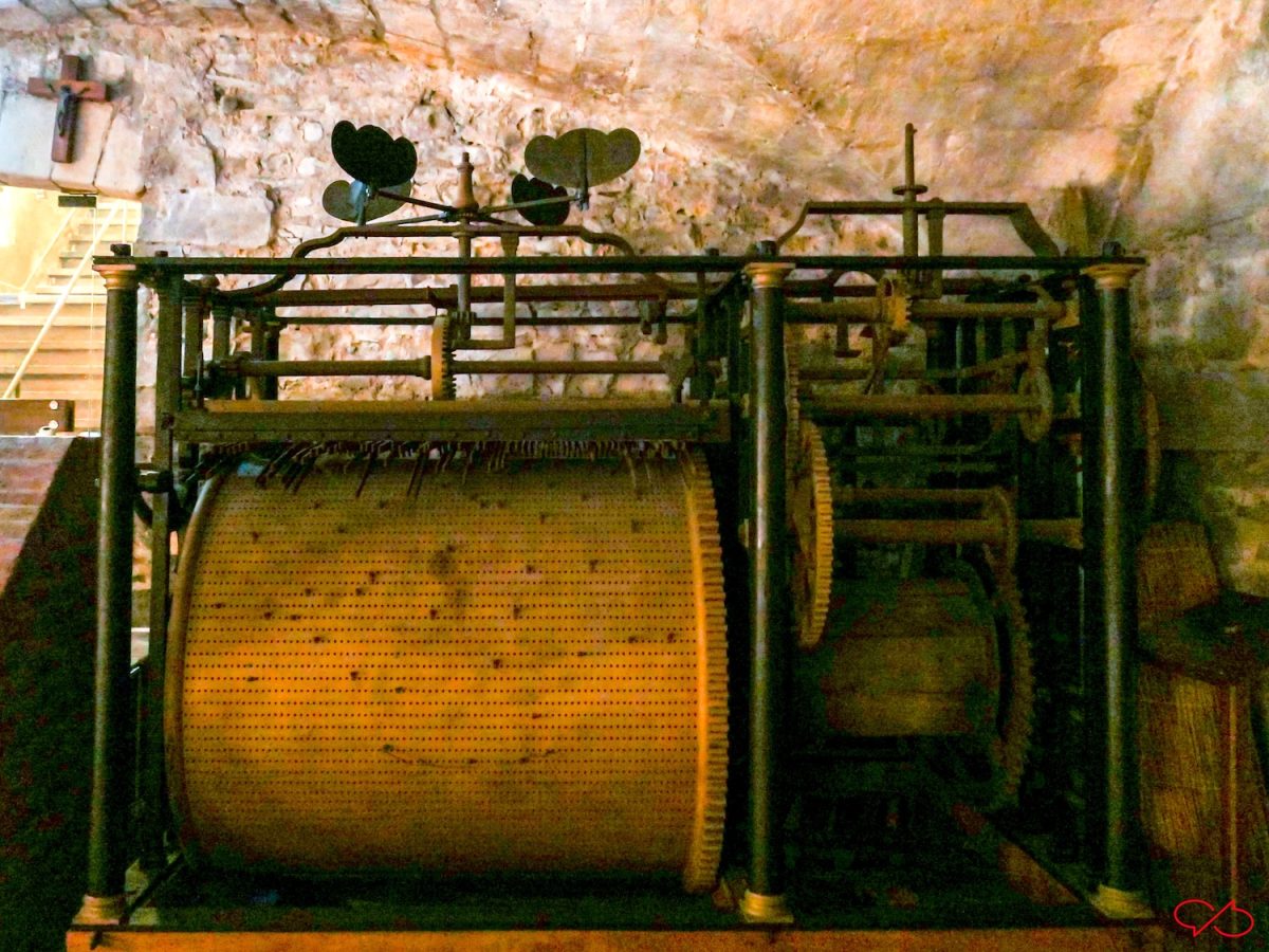 Links zien we een grote speeltrommel. Er zitten nokjes op die de armen daarboven omhoog duwen tijdens het draaien. Aan de armen zijn met staaldraden de carillonklokken verbonden. Het betekent dat er per ronde een melodie klonk. Als men een andere melodie wou, moest die met de nokjes ingesteld worden.