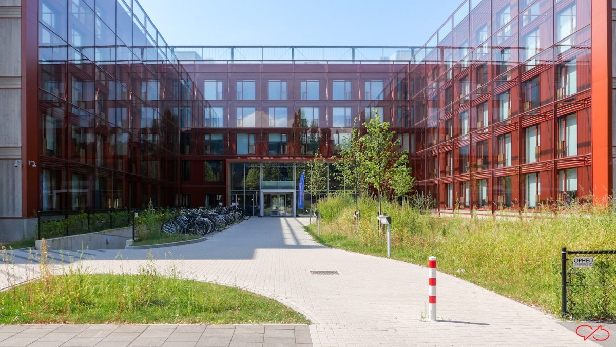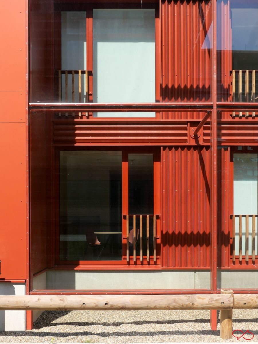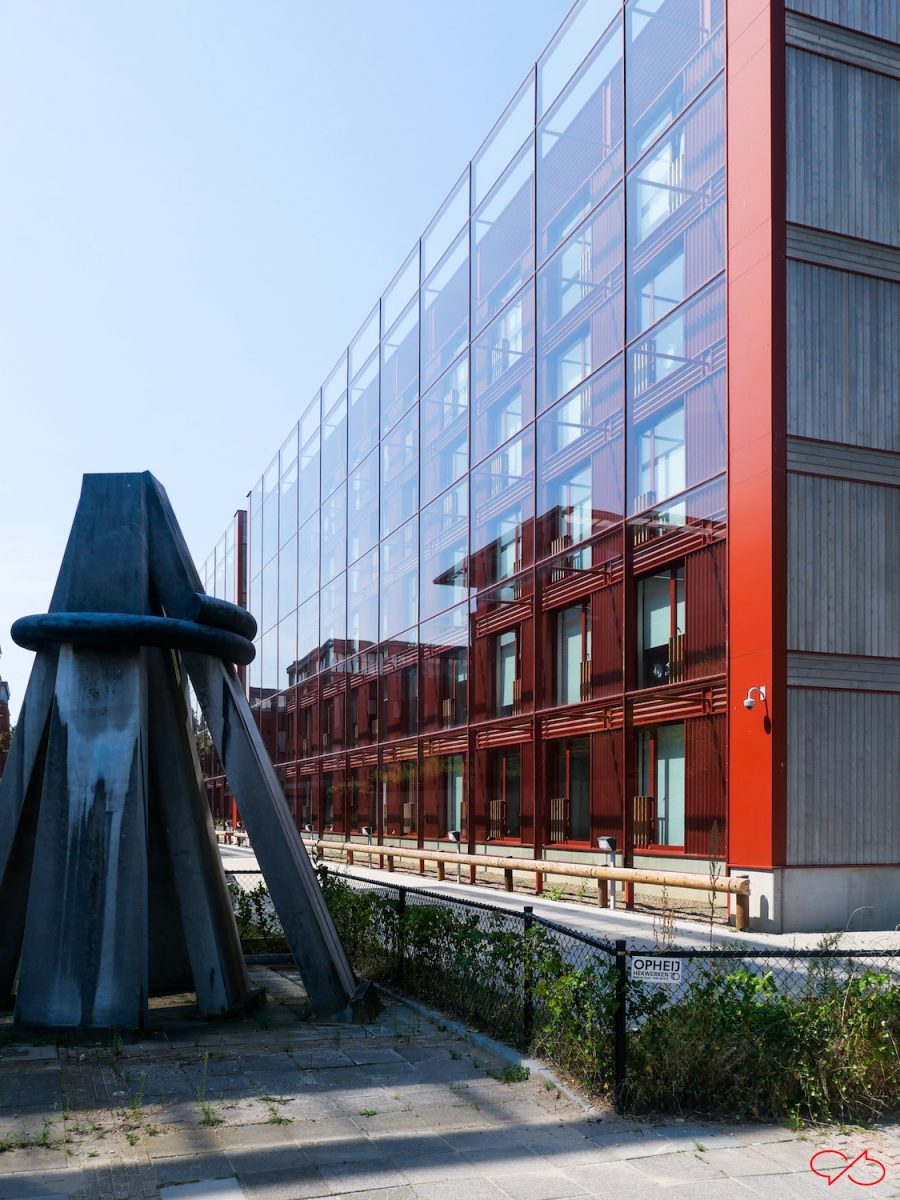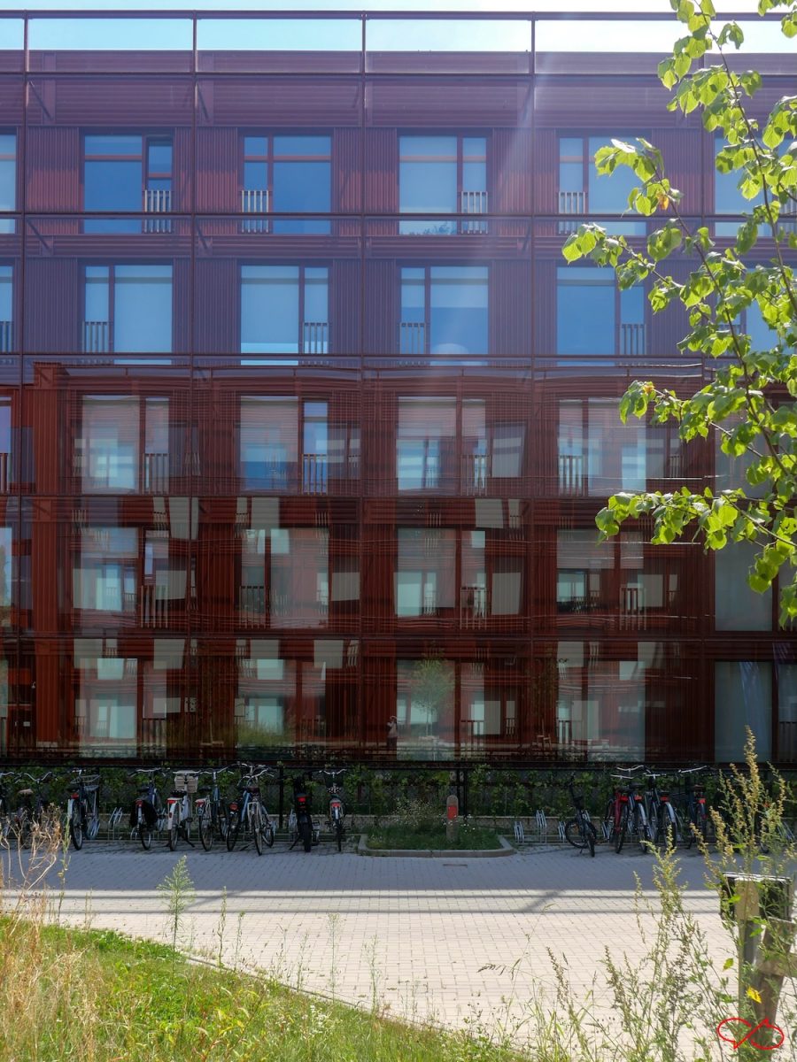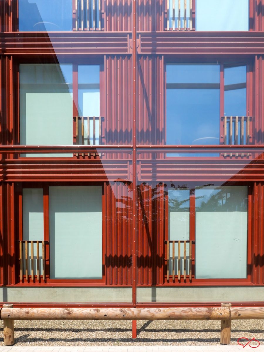 Ik ben onder de indruk van het gebouw. Het is in een H-vorm met twee binnentuinen. De ritmes van de puien zijn prachtig en de materialen en kleuren doen fris aan.