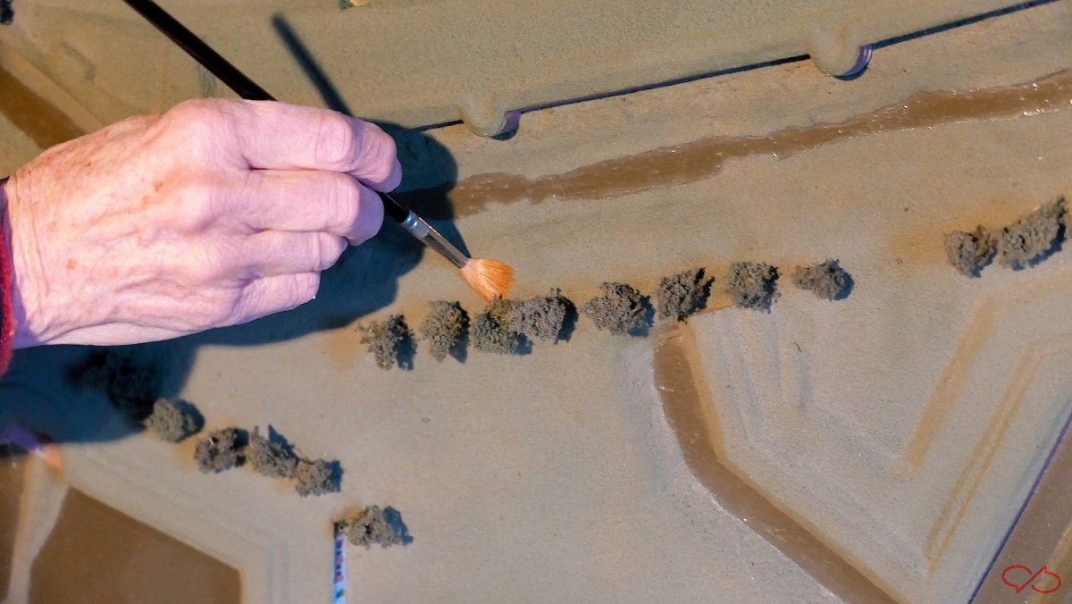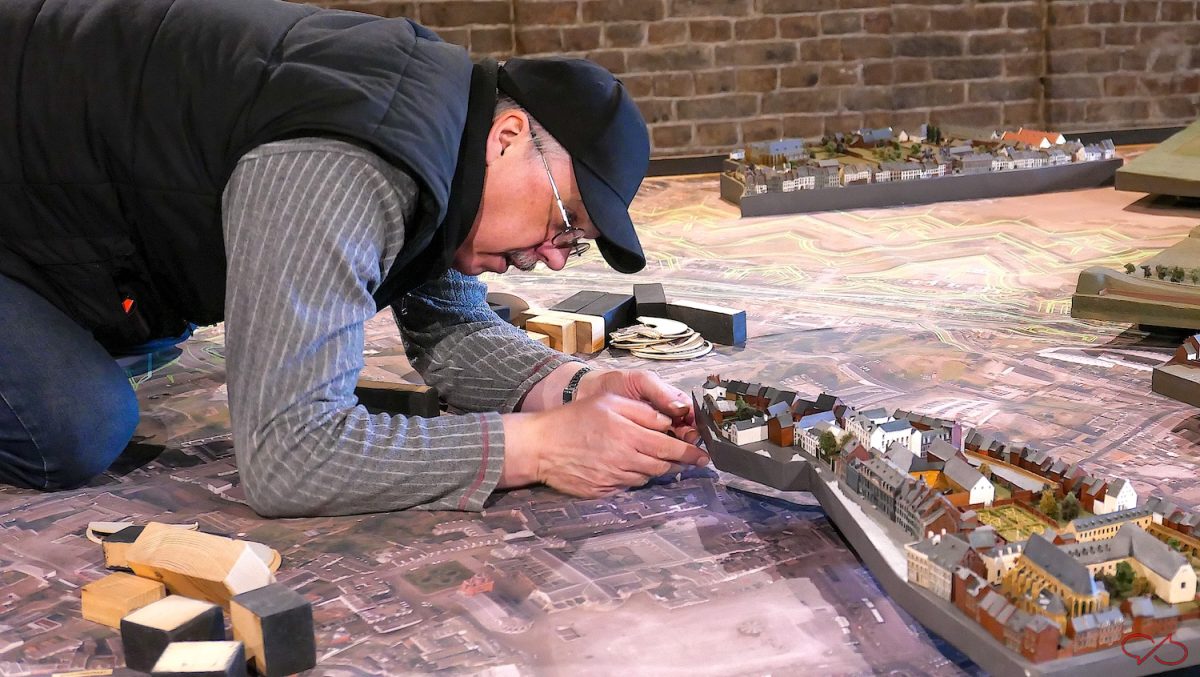 Het was tijd voor de jaarlijkse poetsbeurt van de maquette: afstoffen. Maar de maquette is zo kwetsbaar, dat het met een kwastje moet.