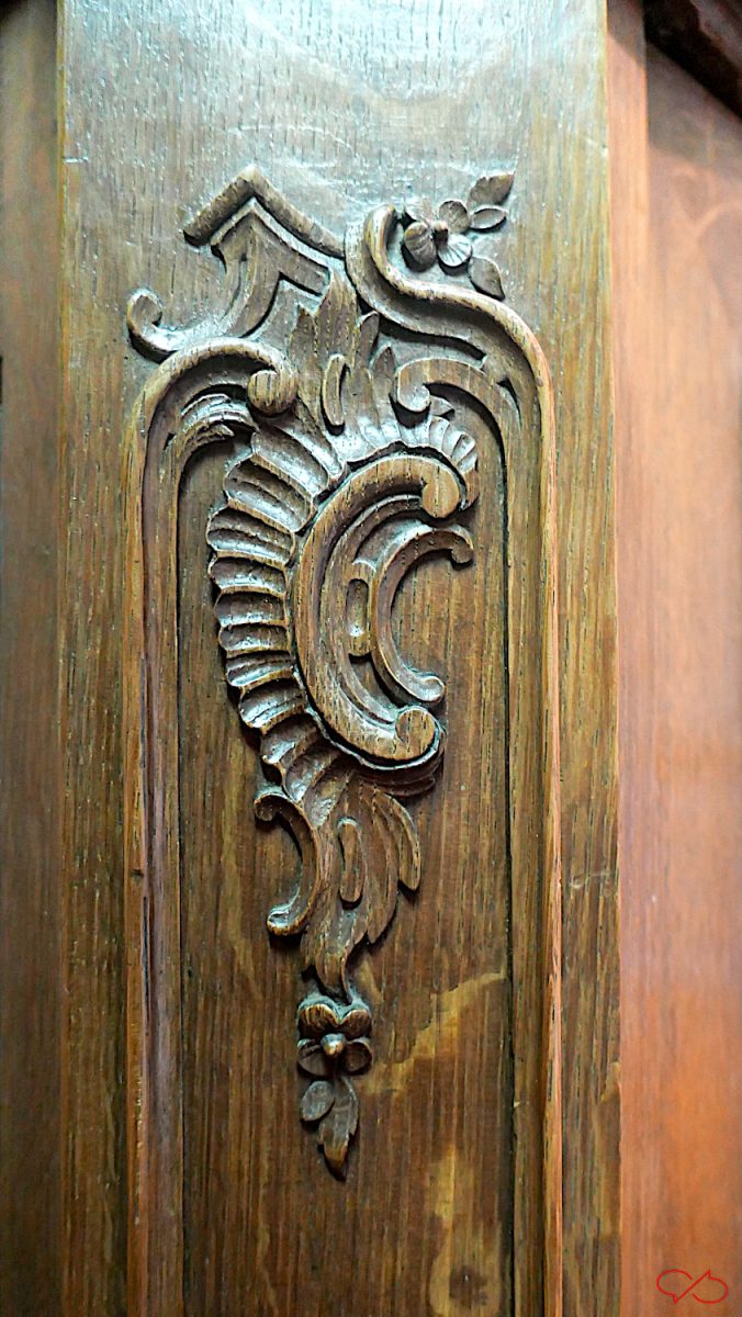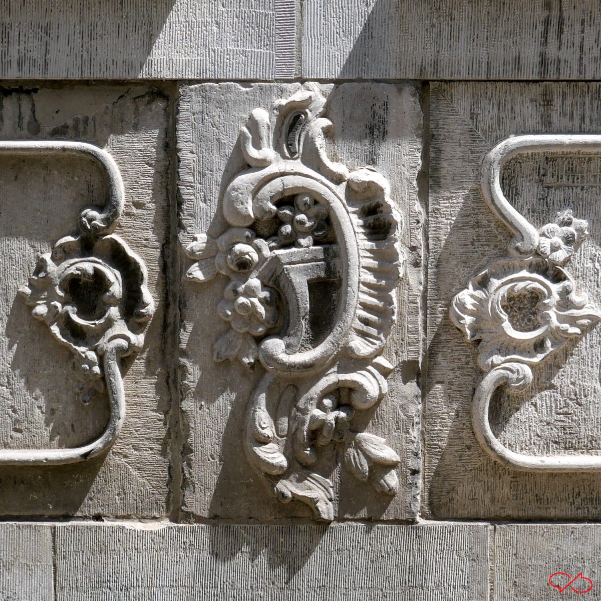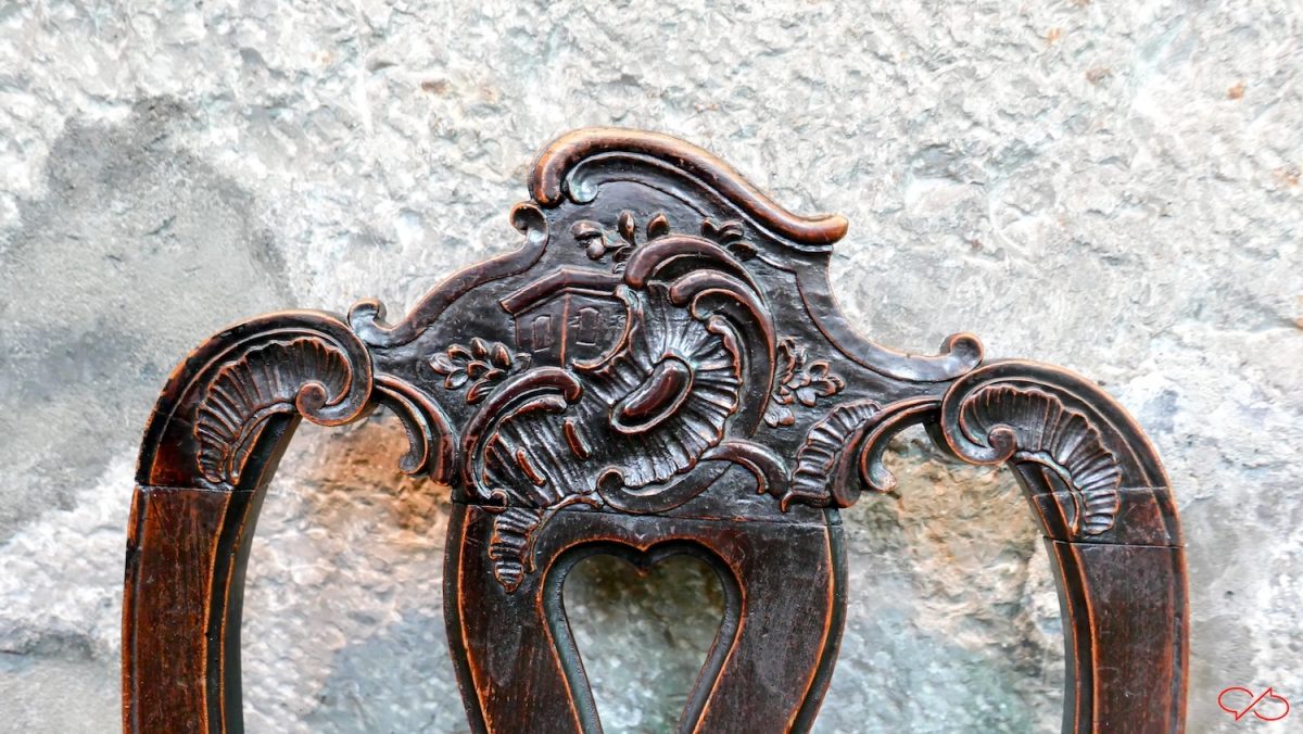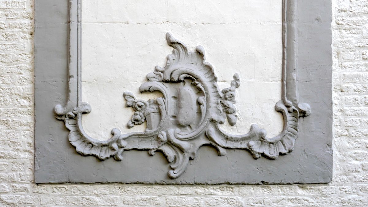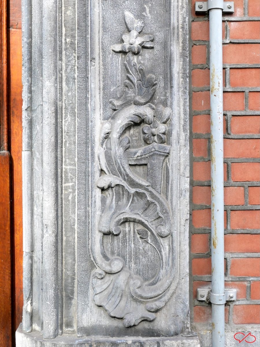 Dat is een 18de eeuwse versiering die vooral in Maastricht en omgeving veel werd toegepast. We zien een rococo-krul, een rocaille of schelp. En daarop staat een huisje, we kijken er schuin tegenaan, in perspectief. Dan zien we een dak en twee ramen. Maar soms is het een tafel. Dan zien we het blad met daaronder een gekrulde tafelpoot. Soms staan er bloemen op de tafel.