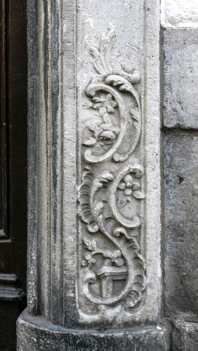 Julien Daenen maakte me erop attent dat er aan pand 29 in de Grote Gracht, In Den Coele Mey, ook een motif perspectif te zien is. In de twee stijlen naast de deur, boven en beneden. Aan de overkant van de straat, in pand Thiessen zit er ook een, aan beide zijden van 1717. En aan de zijkant van een pand aan de Kanunnikencour ook. En in de gevel van pand 17 aan de Stokstraat. Het is de gevel die ooit in de Grote Staat stond.