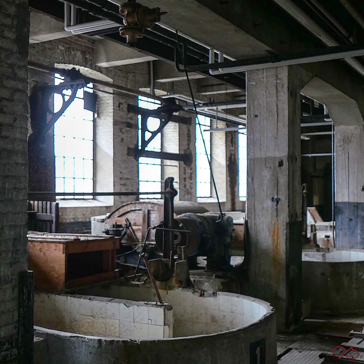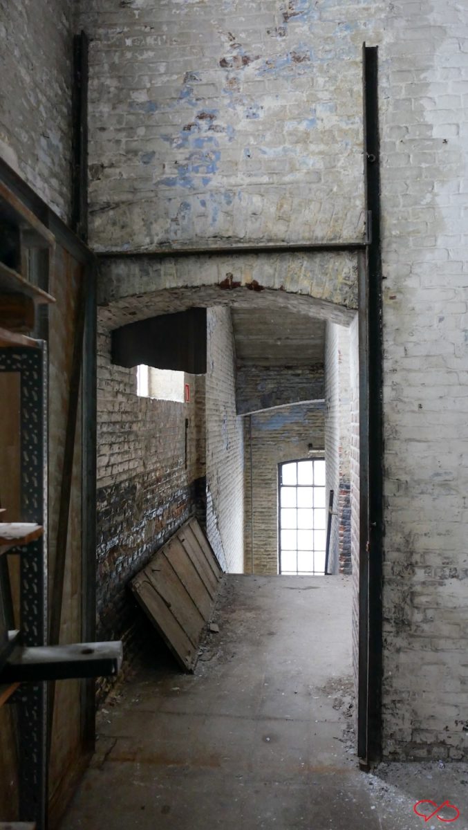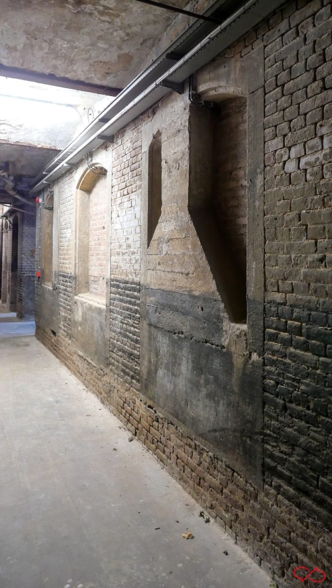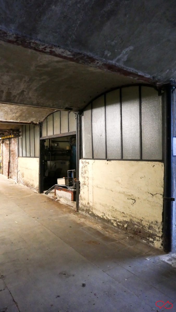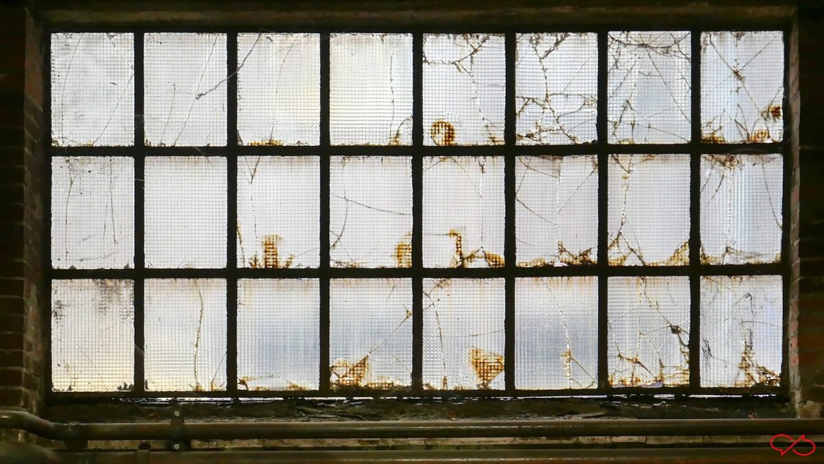 Gangen waren gangen, ramen waren ramen, toen. Na diverse verbouwingen en aanpassingen is het nu in onbruik geraakt. Maar we zien voor ons geestesoog de arbeiders die in het schemerige licht hun werk deden. Zelfs het daglicht door dat roestige raam is zichzelf niet meer. Merk op dat het matglas is. Zo komt er wel licht binnen, maar kan de arbeider niet naar buiten kijken.