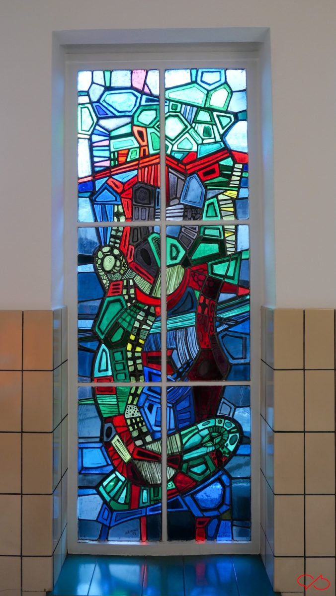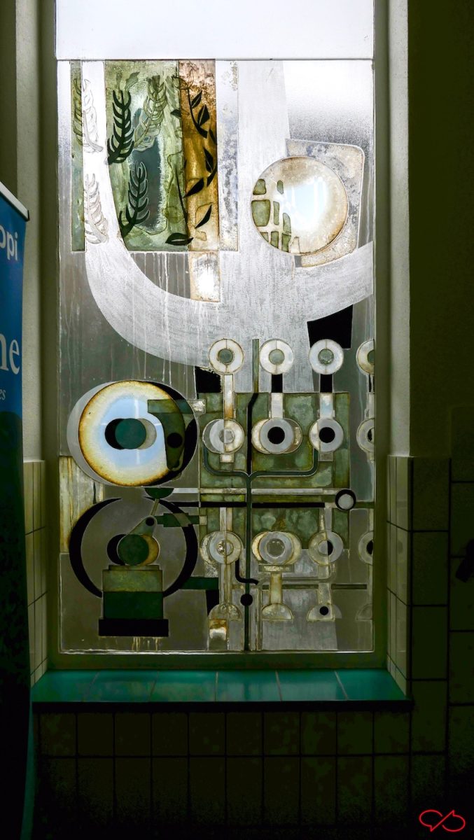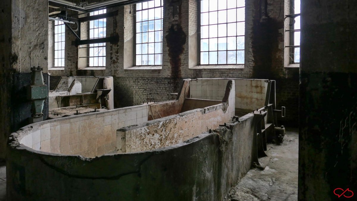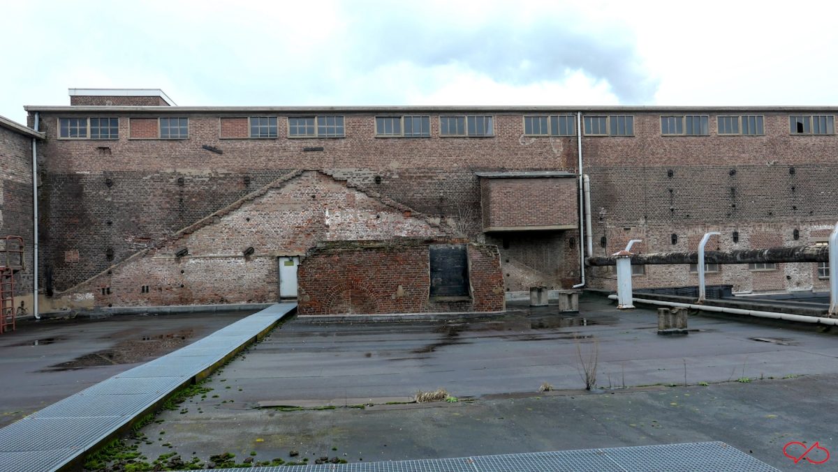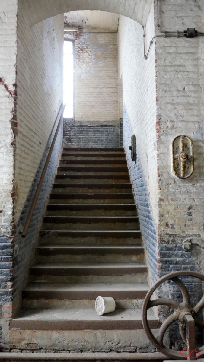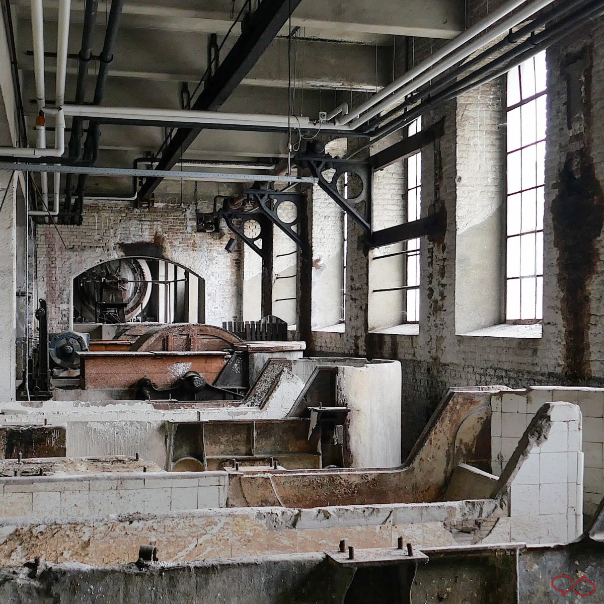 Gangen waren gangen, ramen waren ramen, toen. Na diverse verbouwingen en aanpassingen is het nu in onbruik geraakt. Maar we zien voor ons geestesoog de arbeiders die in het schemerige licht hun werk deden. Zelfs het daglicht door dat roestige raam is zichzelf niet meer. Merk op dat het matglas is. Zo komt er wel licht binnen, maar kan de arbeider niet naar buiten kijken.