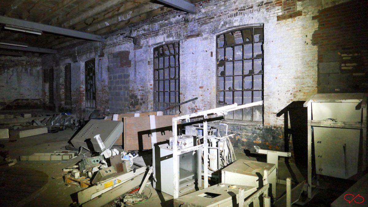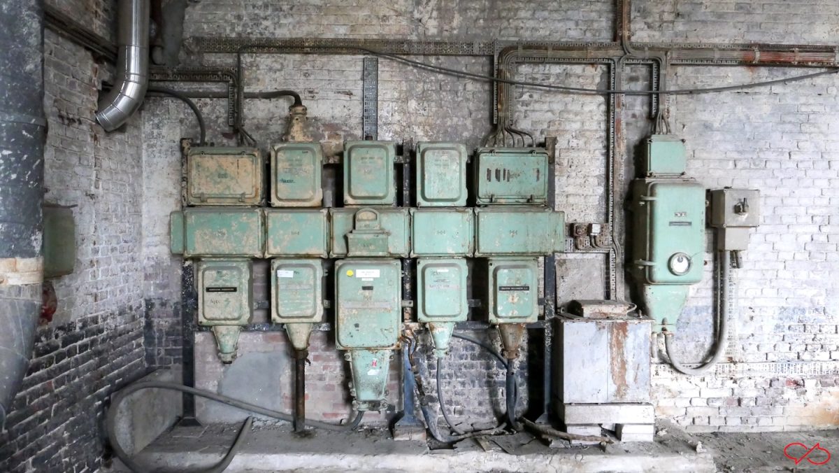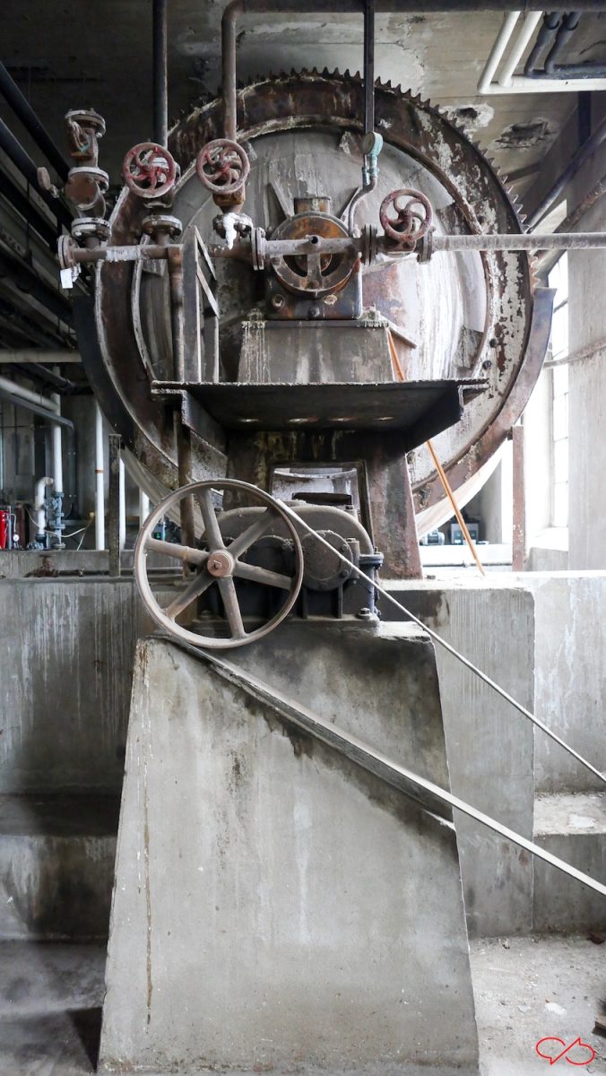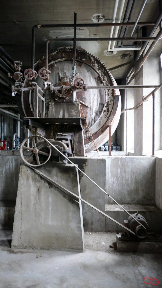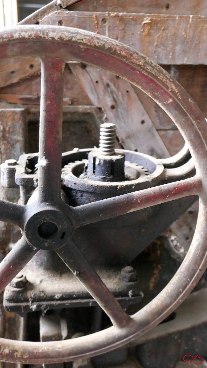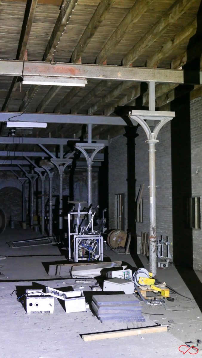 En dus elektriciteitskasten en -leidingen. Waar de machine eerst van bovenaf werd aangedreven door de hoofdas, kon dat nu van beneden met een elektromotor. Met een riem over hetzelfde wiel. We kwamen door een fabriekshal waar duizenden motoren liggen opgeslagen.