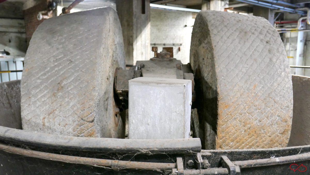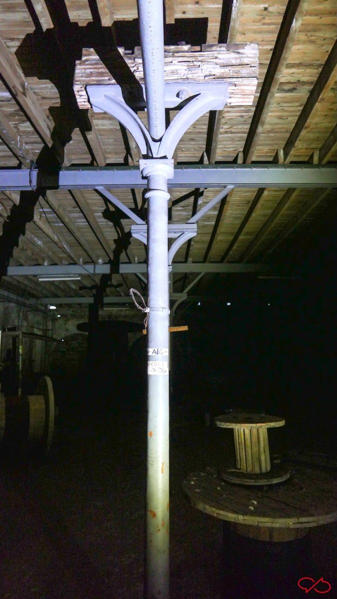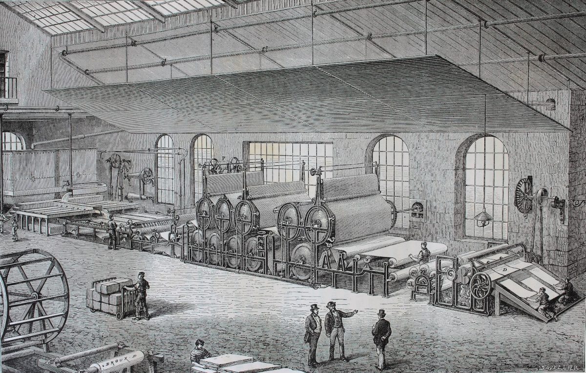 Ooit werd het papier met de hand gemaakt. Handgeschept papier, het bestaat nog steeds. Maar dat was zwaar en tijdrovend. En het leverde losse vellen terwijl een lange strook veel efficiënter was. Dus een stoommachine. Één machine voor de hele fabriek. Met een stelsel van assen werd de aandrijving voor alle andere machines gedistribueerd. Ik het oude deel zijn daar nog resten van te vinden. Bijvoorbeeld de V-vormige doorvoer die aan het plafond hangt of de zwarte consoles aan de pilaren. Daarop zaten de lagers waar de as in draaide.