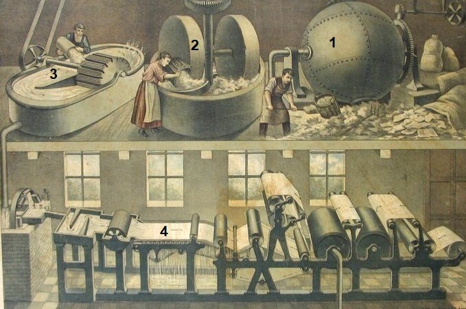 De vezels voor het papier moesten kort zijn, anders kon je het niet scheuren. Daarom moesten de lommele vermalen worden. Daar waren verschillende machines voor: 1 de bolkoker om de lommele te koken en zacht te maken, 2 de kollergang om te malen, 3 de Hollander om het tot gelijkmatige pulp te snijden. Van de ene bak in de andere deed de mens, zwaar werk. Vervolgens ging de pulp naar 4 de papiermachine. Helaas zijn alle machines ontmanteld, we kunnen niet meer zien hoe die er uitzagen. Maar de oude gravure geeft er een interessant beeld van. Links stroomt de kletsnatte pulp op een transportbandachtige zeef. Het water werd eruit geperst en de papierbaan werd van de zeef gescheiden. Tussen walsen (de cilinders) door om te drogen en te pletten. Rechts werd de baan in stroken en vellen gesneden. Merk op dat de aandrijving van achter de muur komt. En zo ruim als op de prent was het in Maastricht zeker niet. De hal was maar half zo breed.