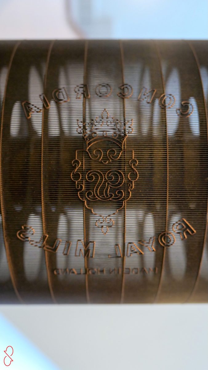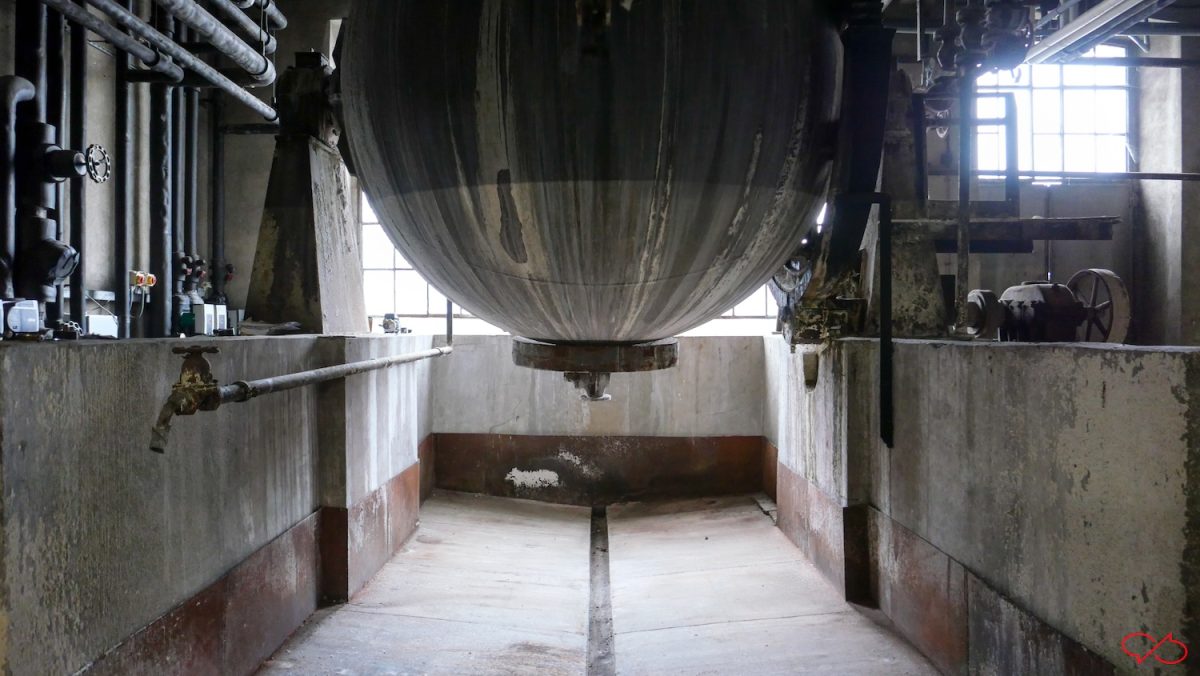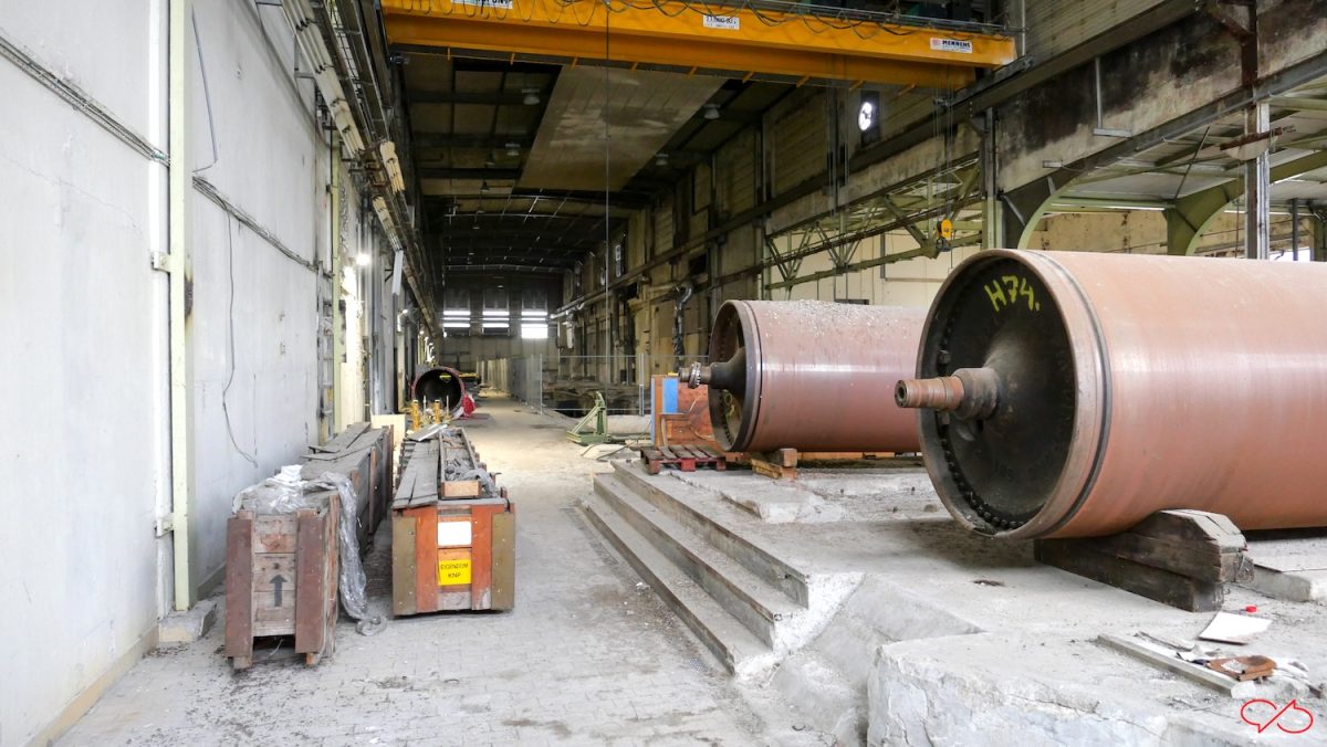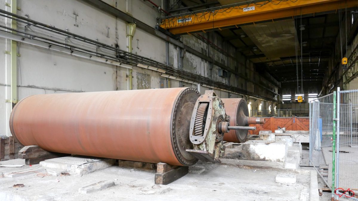 Op de voorgrond zien we wat grote cilinders liggen, het zijn walsen. Die pletten en drogen het papier. Een daarvan is gemaakt in 1961 voor de PM 6 die toen gebouwd werd. Op de zijkant staat: Beloit Italia Pinerolo 1961. Beloit was een Amerikaans bedrijf met een dochteronderneming in Pinerolo Italië. Daar werden machines gemaakt voor de papierindustrie.