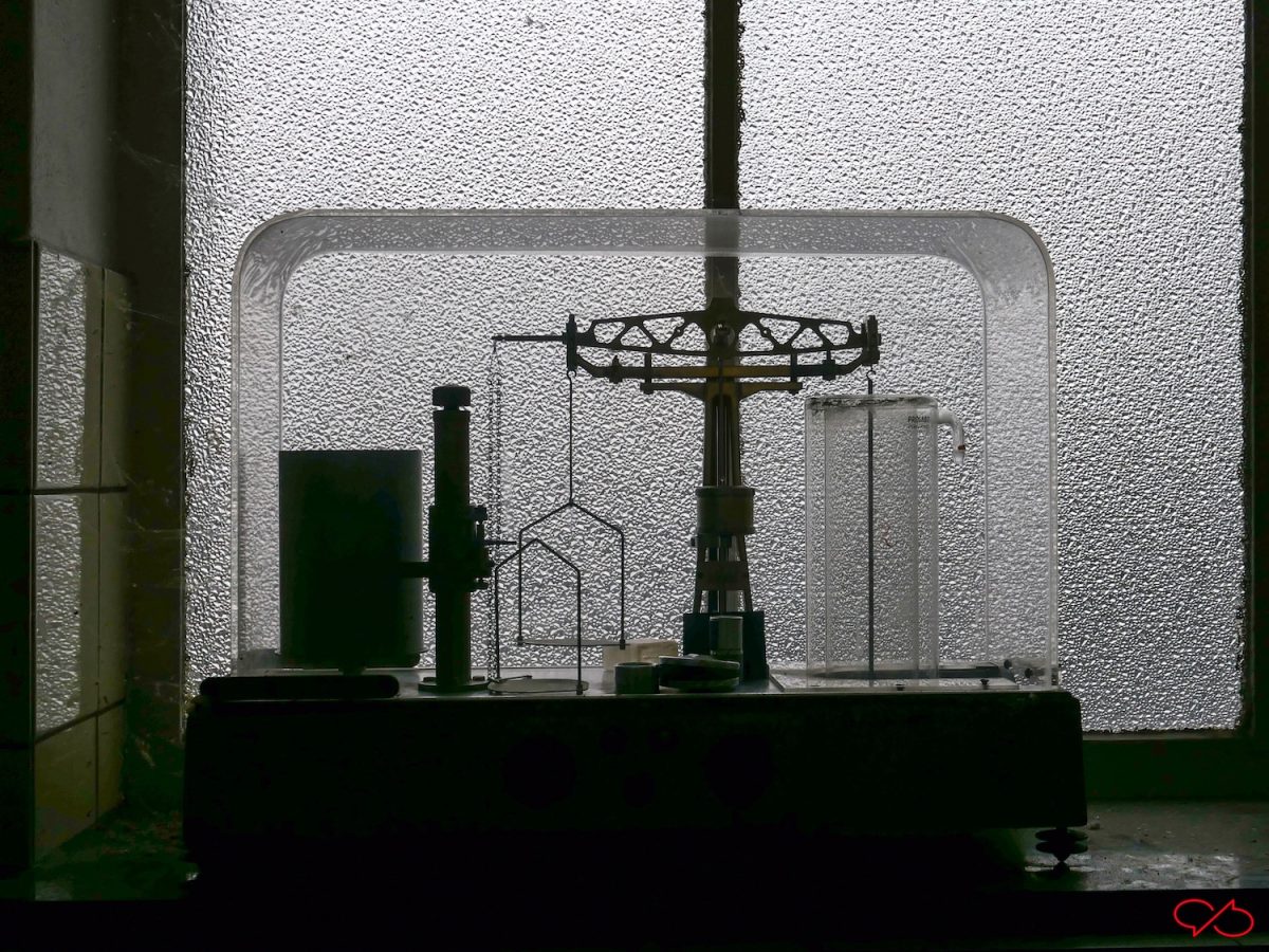 We kwamen aan bij het kantoorgedeelte van de papierfabriek. Tegen een raam stond, in een stolp, een meetapparaat. Het lijkt op een zeer nauwkeurige weegschaal. Het hoort bij het laboratorium dat hier ligt. De tegeltjes links geven de grootte aan. Ook hier ramen waardoor men niet naar buiten kan kijken.