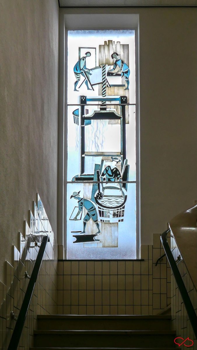 Maar voor de kantoren deed men graag aan cultuur. Het toont smaak en verhoogt de uitstraling, goed voor de klandizie. Zo zien we een paar fraaie glas-in-loodramen. De eerste verbeeldt de traditionele papierfabricage door handwerk. De tweede laat het moderne procédé zien. Bovenaan het hout waarvan cellulose gemaakt wordt. Daaronder de walsen waar het papier doorheen gaat en uiteindelijk wordt op grote rollen gewikkeld. Dan een zeer abstracte, gemaakt door Ad Maas in 1959, uitgevoerd door Felix.