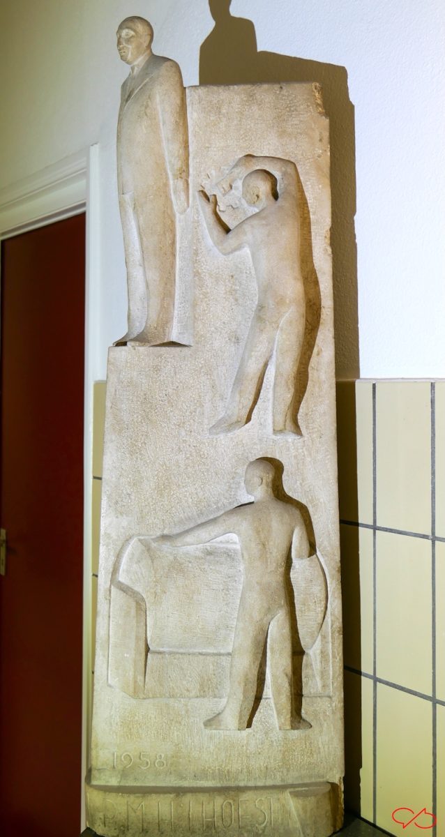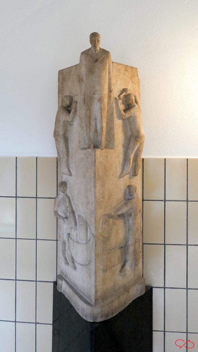 En dan een sculptuur. Ook hier wordt de fabricage uitgebeeld. Bovenaan de directeur. Op de voet staat Directeur Ir. L.P.M.H. Lhoest, 1933-1958. Heeft iemand nog een aardig inkoppertje?