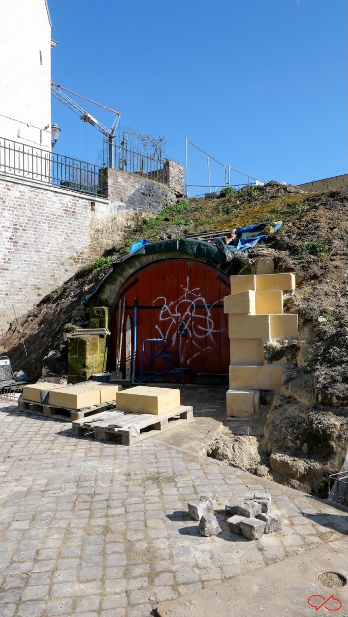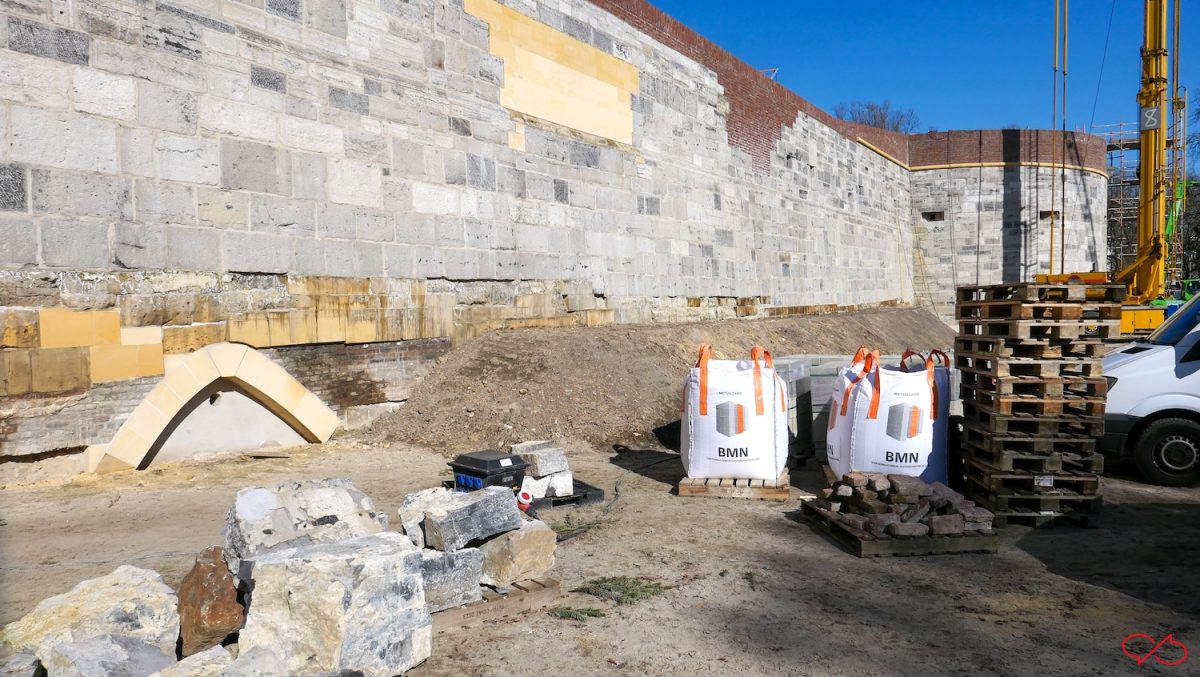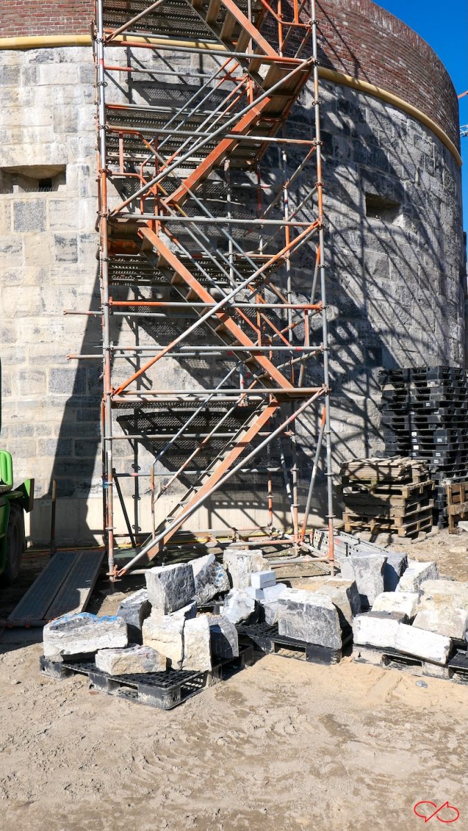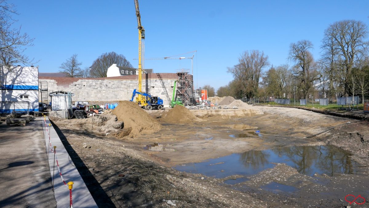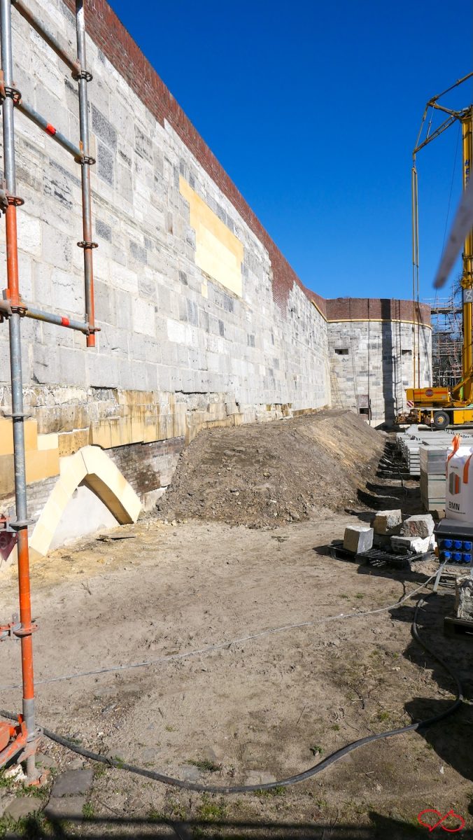 Ik kwam er toch langs en ik heb wat foto’s gemaakt die de situatie van nu laten (6 maart 2025) zien. Het werk aan de muren en randen is bijna klaar. De vijver is leeg tot op de bodem en een deel van het bouwterrein moet ook leeggemaakt worden zodat de vijver uitgebreid kan worden tot aan de muren. Het is de plek waar op de foto nog een kraan en steigers staan. De strook opgeworpen aarde aan de voet van de muur blijft, daar komt wat begroeiing. Ook de andere kant, die met de toegangspoort is ver af. Ook hier zal het talud nog worden aangekleed met groen.