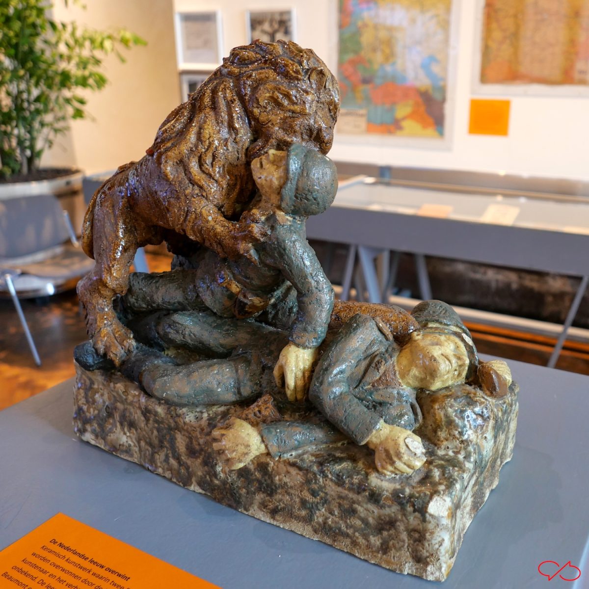 De Nederlandse Leeuw die de vijand vermorzelt. Het is een beeld van een onbekende Maastrichtse kunstenaar.