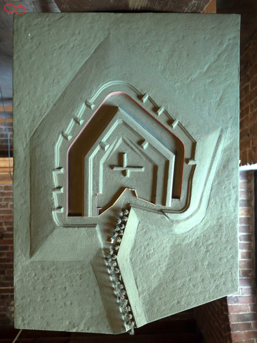 Op de eerste foto zien we het fort in de toestand van 1867. Dat is zo’n 50 jaar na de bouw van het fort, de vestingstatus van Maastricht bestond nog net. We zien duidelijk de contouren, de hoge en lage delen. Aan de onderkant de bedekte weg met bomen. Die weg lag diep zodat de soldaten ongezien van het fort naar de stad konden. De foto laat een stukje van de Maquette 1867 zien.