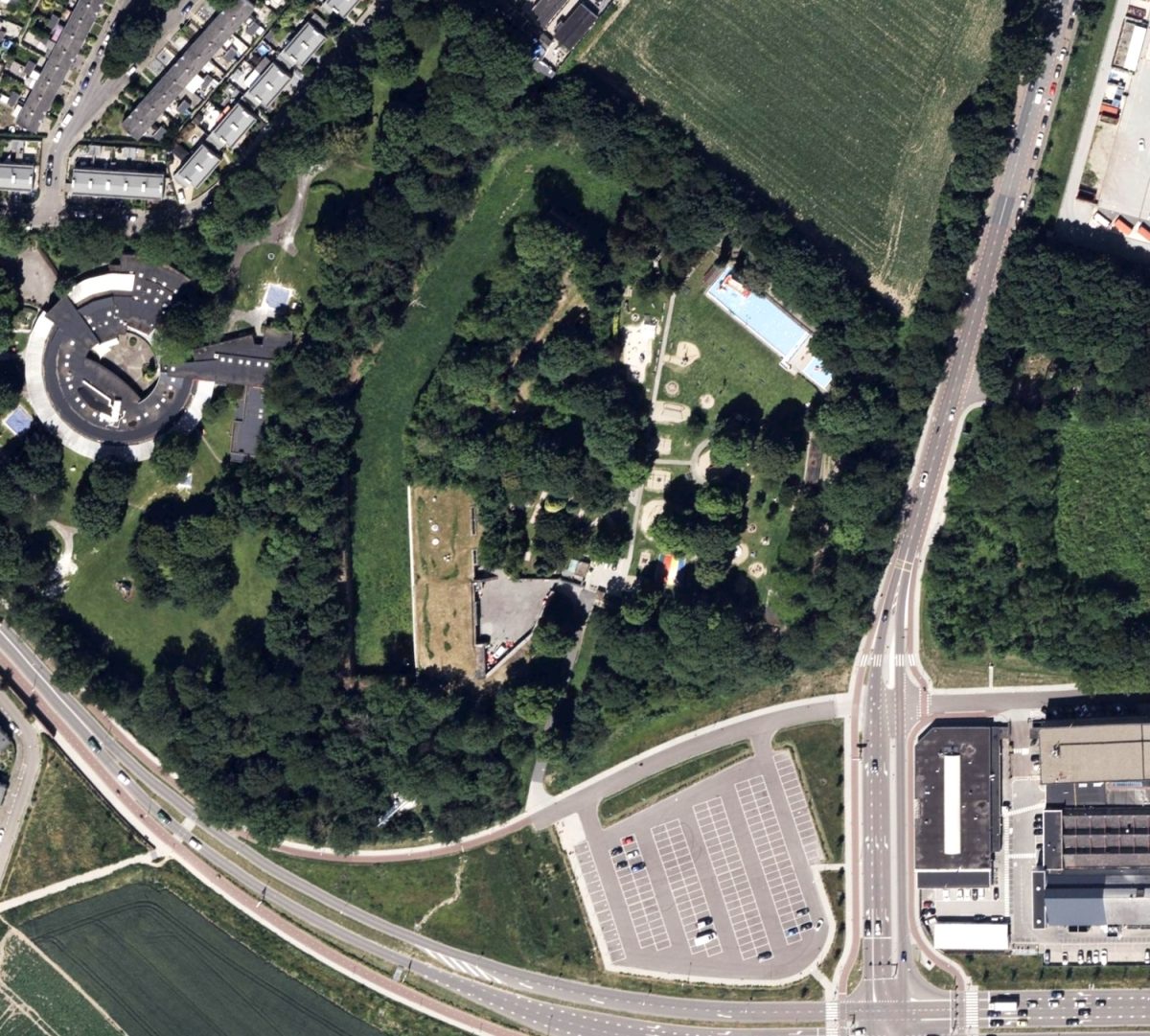 Op de eerste foto zien we het fort nog een keer. Een deel van het terrein was van de Gemeente Maastricht. Daar is nu speeltuin Fort Willem (rood).
