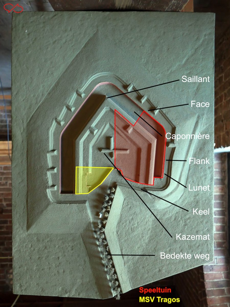 Het is de bunker waarvan we de ingang gezien hebben. Het is een grote kazemat. De kazemat ligt in een vijfhoekig lunet. De zijde aan de kant van de stad wordt keel genoemd. De twee zijden daaraan vast zijn de flanken en de twee zijden aan de top heten facen.