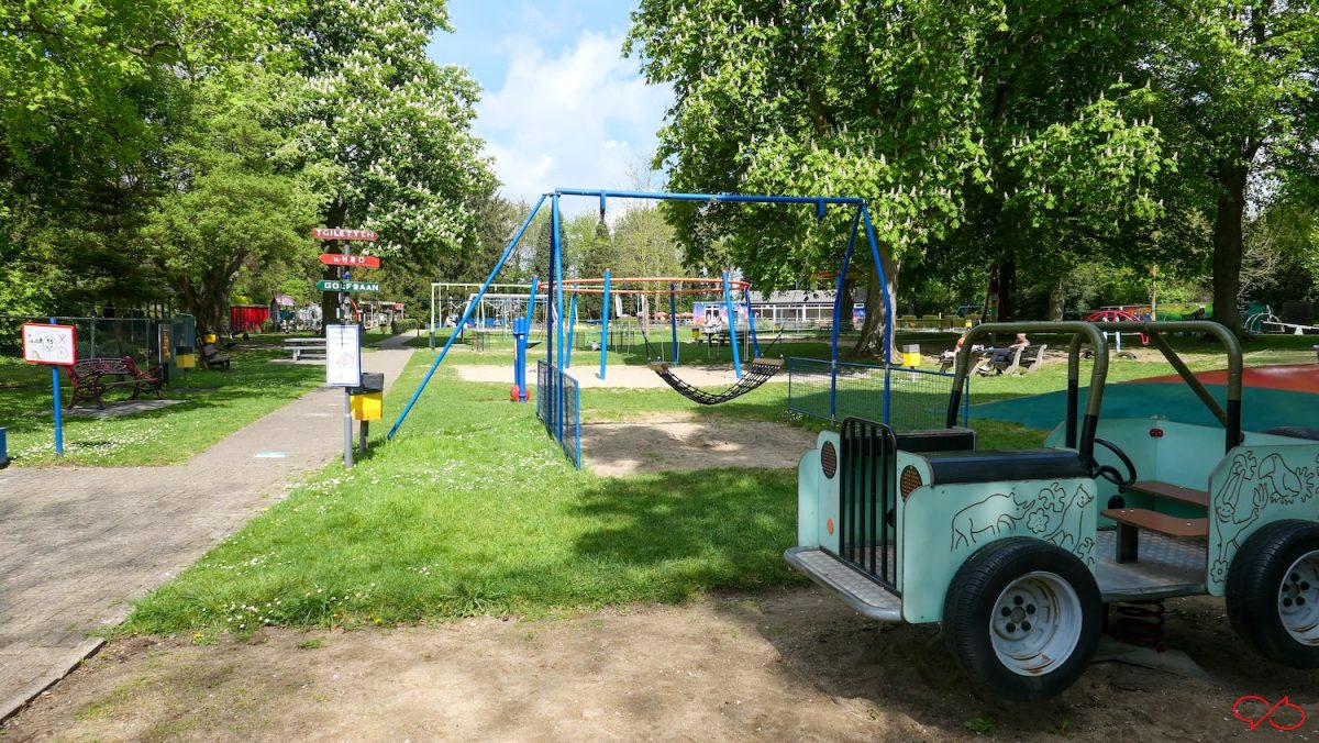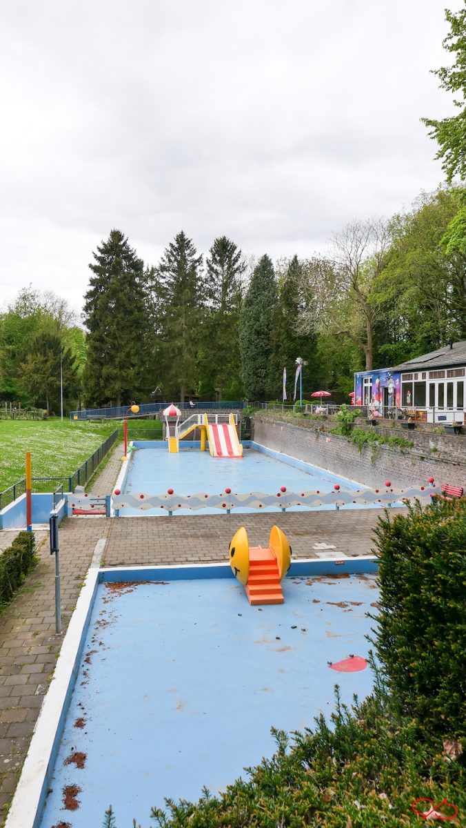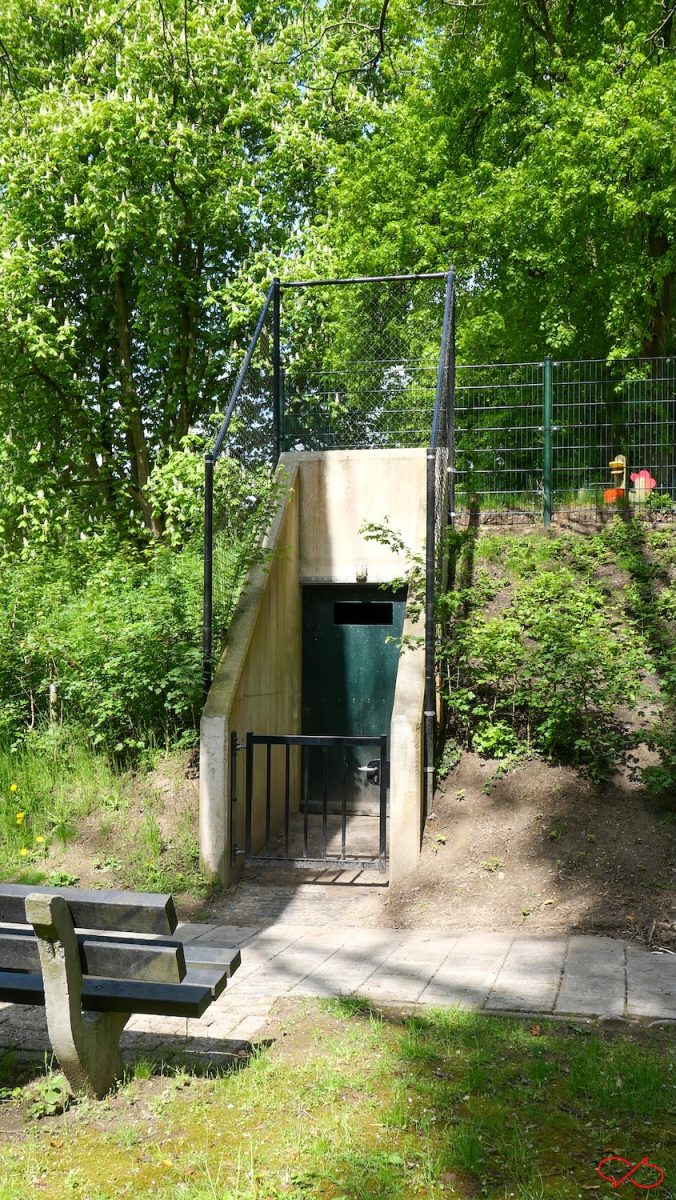 In een deel van de droge gracht is het natte zwembad van de speeltuin. En in de speeltuin is achter een hekje en een stalen deur de ingang naar de gangen. We gaan kijken.