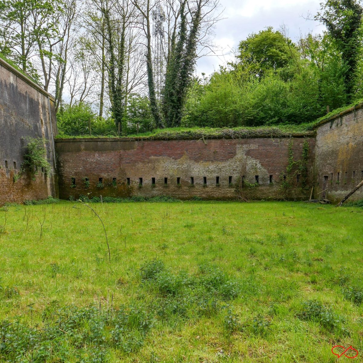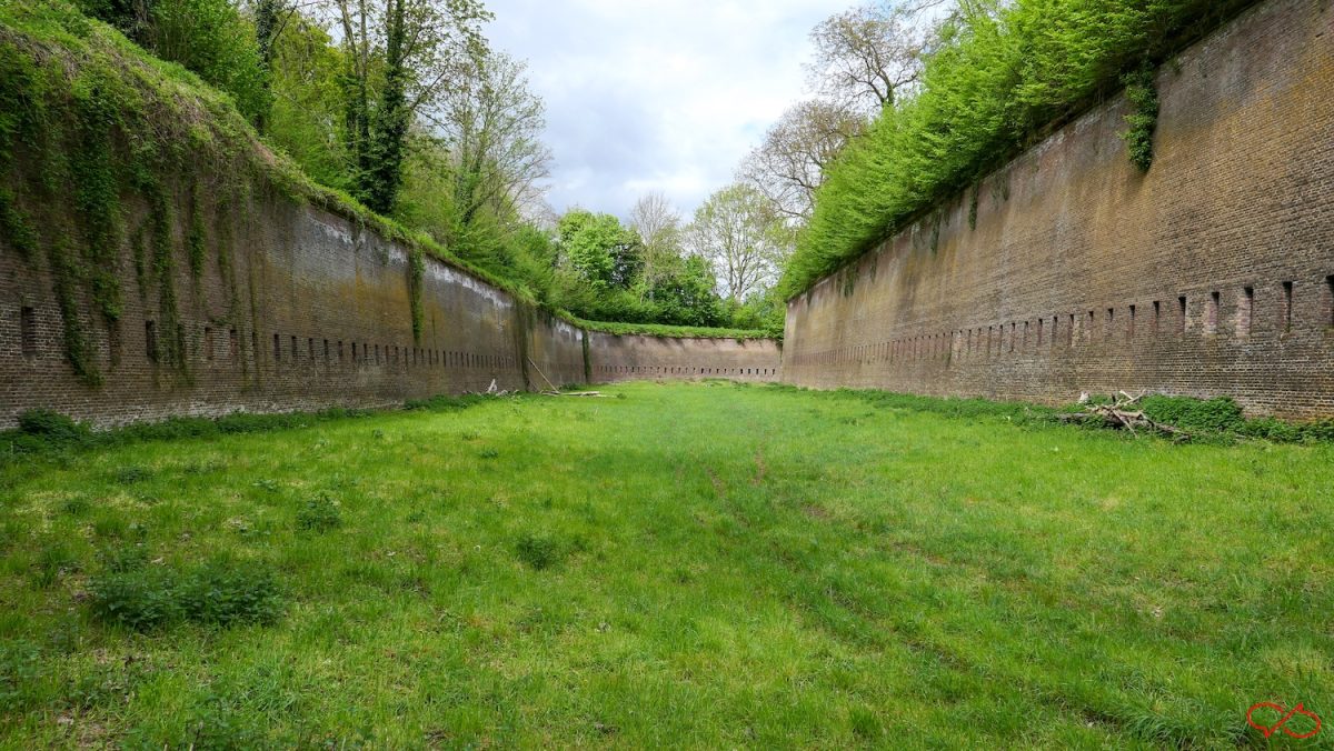 Het fort is niet alleen gangen met schietgaten, maar ook een prachtig terrein tussen de muren, de droge gracht of caponnière met aan beide zijden de muren. Die hebben ook namen: de escarp aan de kant van de kazemat en contrescarp aan de buitenkant. Ook zien we het einde van de caponnière. Het is een prachtige groene en stille omgeving. Ergens lag nog een oude kanonskogel🤪, merk Kipsta B300. Eén geworden met zichzelf en z’n omgeving.