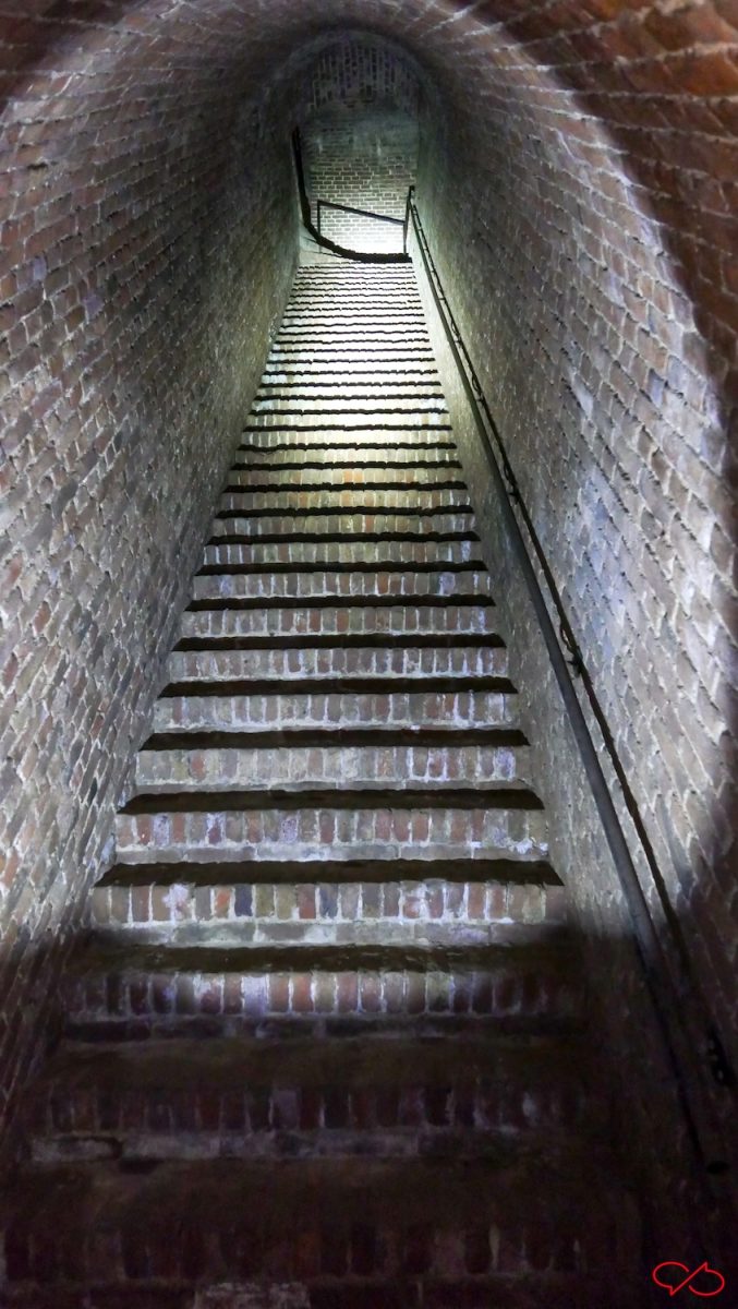 Soldaten moeten van de buitenkant naar de binnenkant, de kazemat, kunnen komen. Of omgekeerd, van de kazemat naar de buitenkant, zonder door de caponnière te gaan. Die is immers gevaarlijk met al die soldaten achter de schietgaten. Ook de vijand kan dat stuk bestoken. Daarom loopt er een tunnel onder de caponnière door. Die tunnel ligt diep, de trappen aan beide zijden zijn lang.