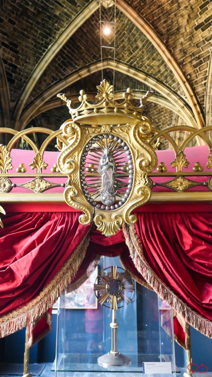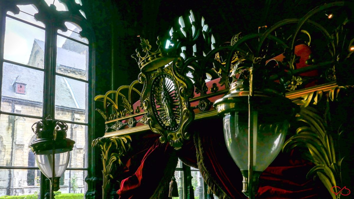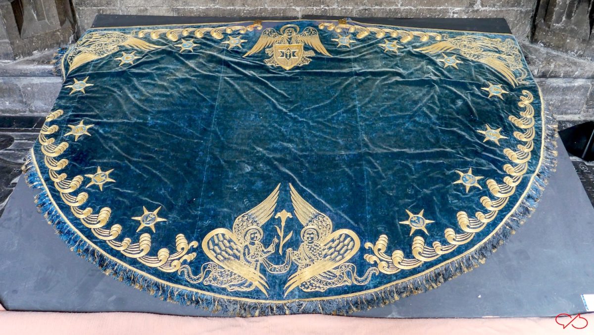 Verder zien we een van de mantels van de Sterre der Zee, het Mariabeeld van de Onze-Lieve-Vrouwe. Het mariablauwe velours is bestikt met gouddraad. We zien de golven van de zee, de lelie als symbool voor reinheid en de engelen die een banderol ophouden met daarin het woord virgo, maagd.