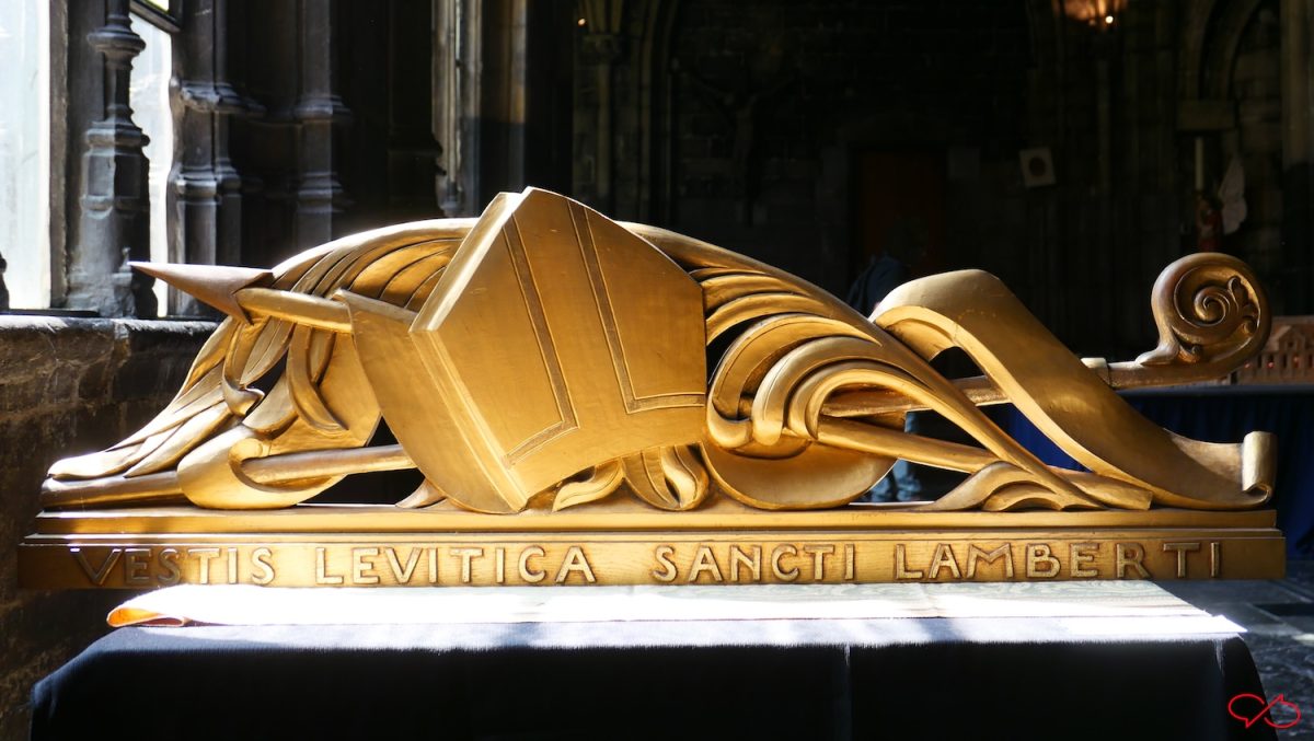 En de vestis levitica, ook wel het levietenkleed, van Sint-Lambertus. Dit is een deel van de kast waarin het kleed wordt meegedragen in processies. De bovenkant van de kast, hier op de foto, is rond 1955 ontworpen door Charles Vos. Het kleed zou 12de eeuws zijn en bestaat uit stroken transparante gaasweefsel van zijde met ingeweven lancetvormige bladmotieven.