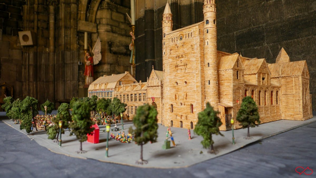 En een aardige maquette van de OLV met het plein. Op de voorgrond het rode poppentheater van Ruben, de groep kinderen zit op de grond, aandachtig te kijken.