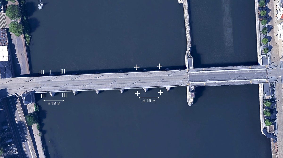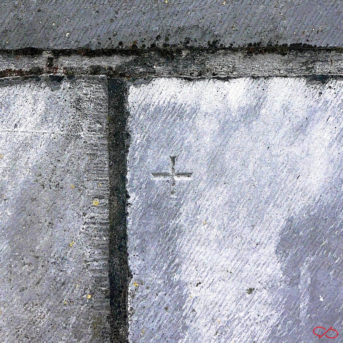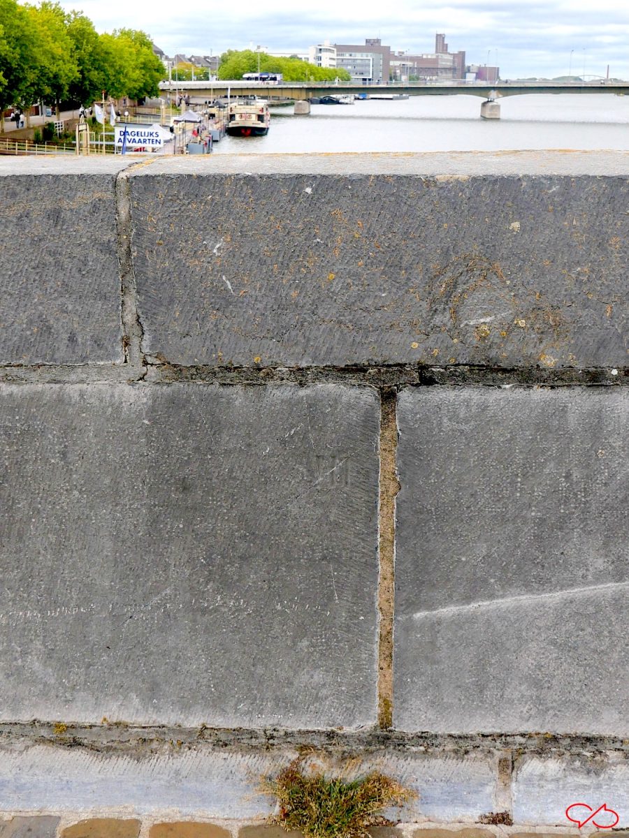 In de natuurstenen balustrade van de brug bevinden zich merktekens, John Kerkhofs maakte me daarop attent. Plussen en drieën, de drieën in Romeinse cijfers. Ik ben gaan kijken en inderdaad. Ik vroeg me af of er wat regelmaat in zat en nog eens inderdaad.