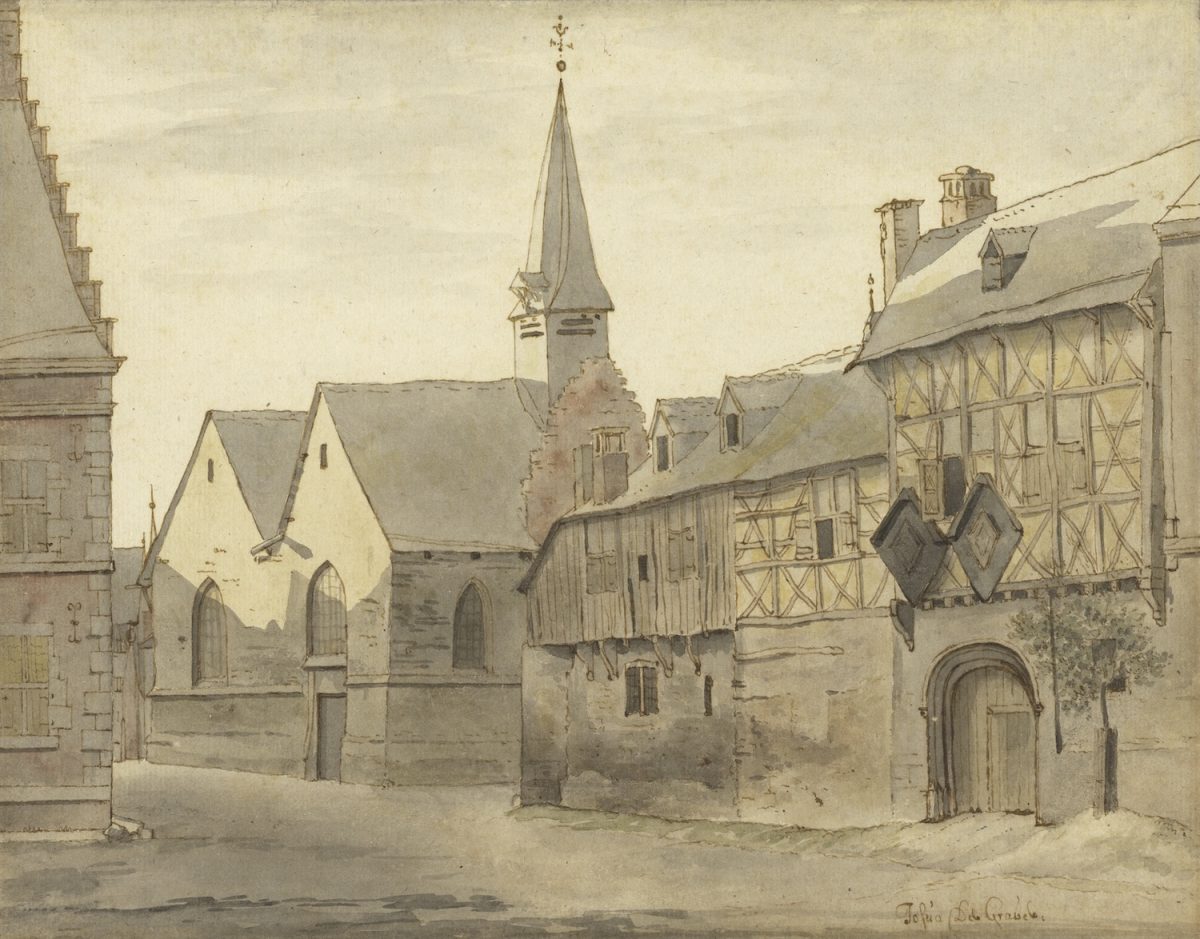 Rouwborden, ze hangen in de kloostergang van de Onze-Lieve-Vrouwebasiliek. Het zijn zwart geschilderde ruitvormige borden die na een overlijden aan de gevel werden gehangen tot de begrafenis. We zien er twee op de tekening van Joshua de Grave uit ongeveer 1670. Ze hangen aan de gevel van het Spaans Gouvernement.