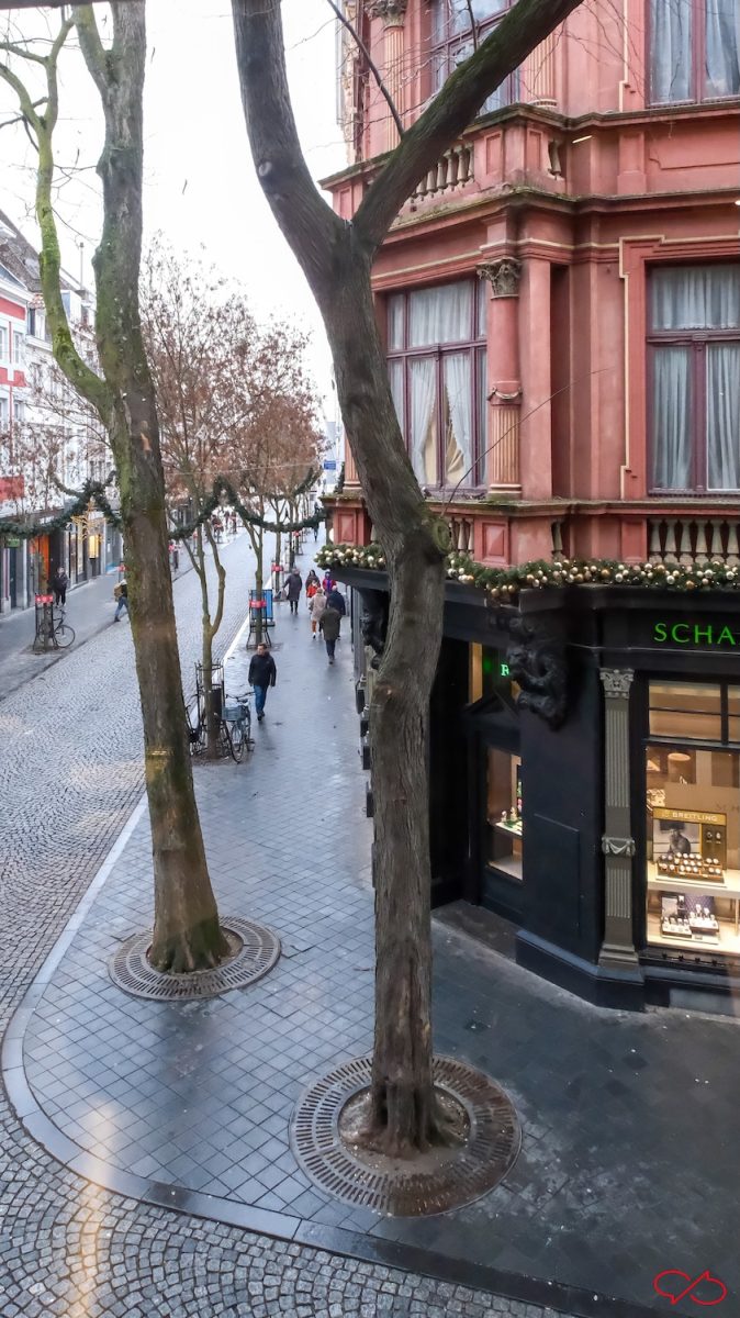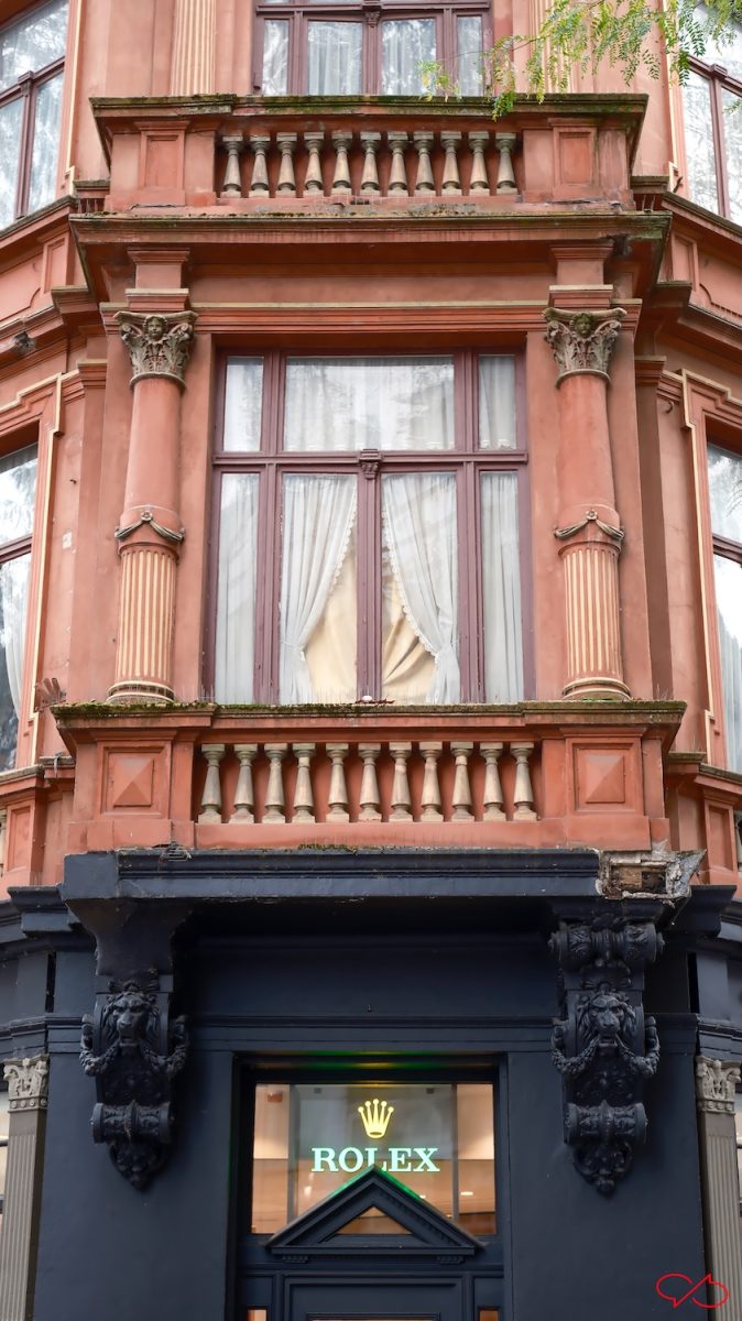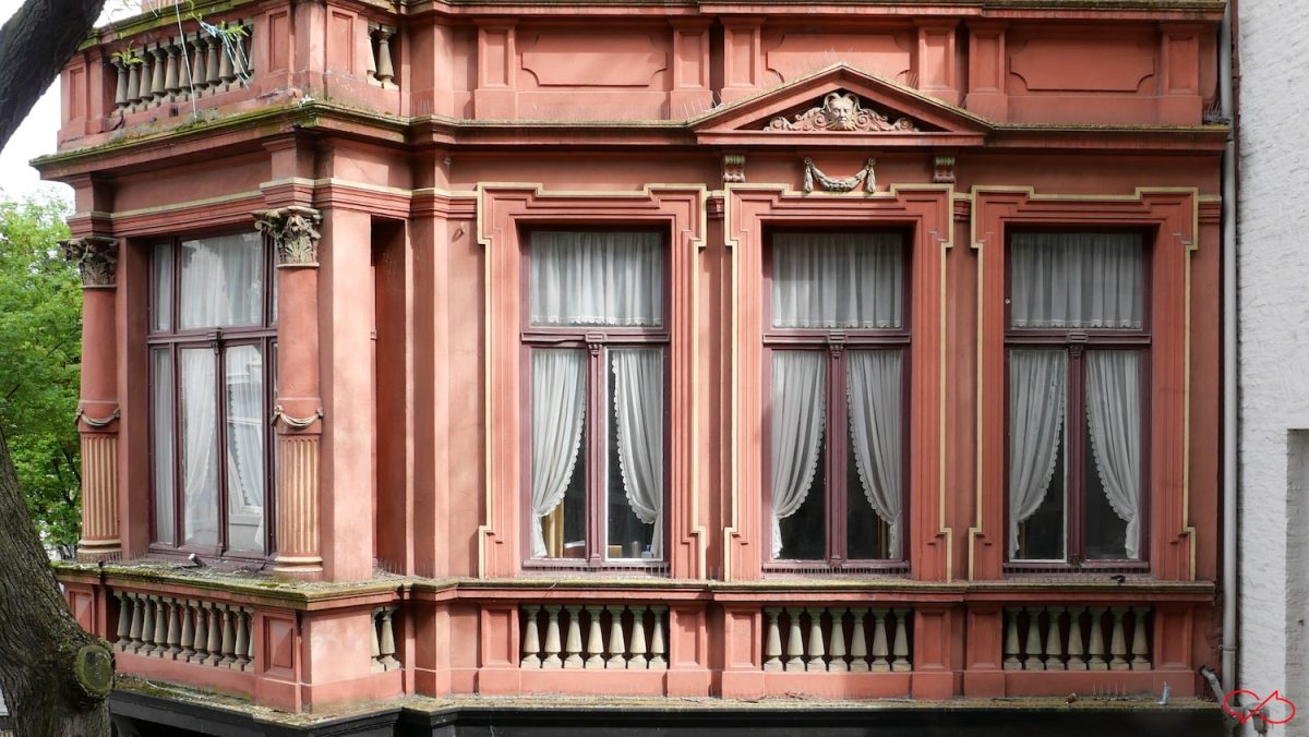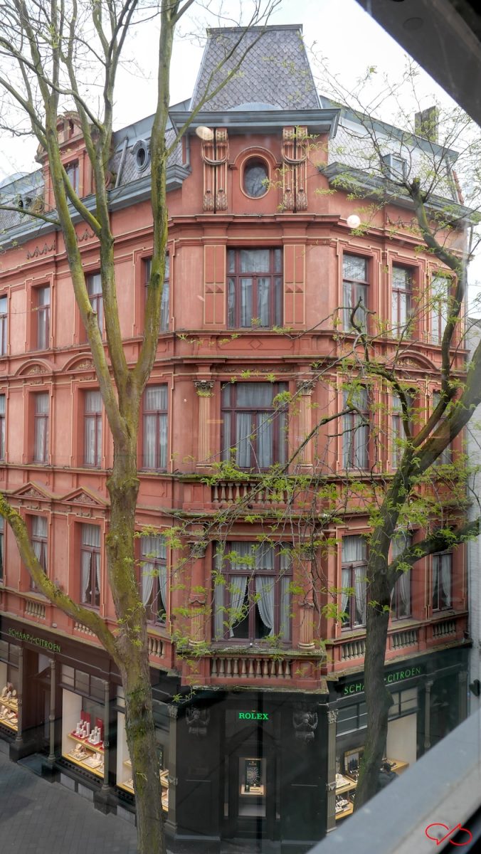 Op de hoek met de Kersenmarkt staat dit markante pand. De stijl is neo classisistisch, de kleur is rood met okerkleurige details. Er zit nu een juwelier in, maar er waren natuurlijk ook andere winkels. Het bovenhuis ziet er bewoond uit. Er zijn pilasters, de halfronde muurzuilen, met rijke kapitelen. Er zijn kleine versieringen als festoenen en balusters. Maar die zijn voor de sier want er zijn geen balkons. Aan beide zijden van de ingang zijn zwarte stenen consoles die heel druk versierd zijn. Ze dragen een schijnbalkon. Aan de linker console ontbreekt een stuk.