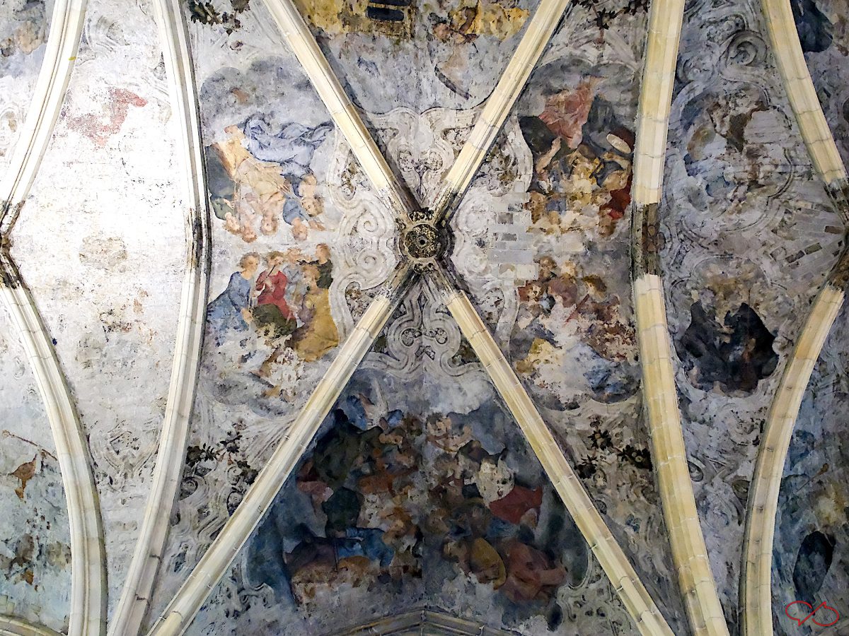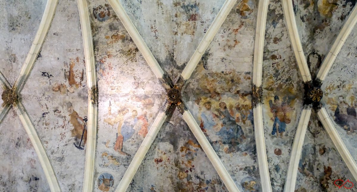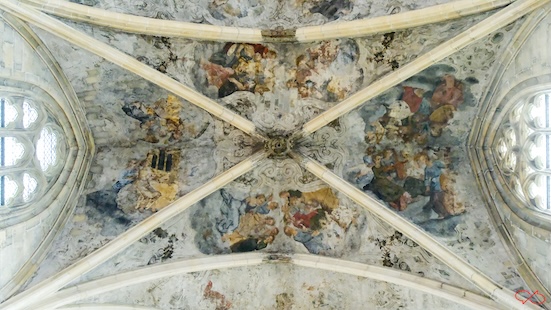 Ik heb toch maar eens even wat opgezocht. De schilderingen zijn in 1618-19 in laat-gotische stijl gemaakt, hoewel de gotiek al lang was afgelopen. De stijl is naar Italiaanse voorbeelden.