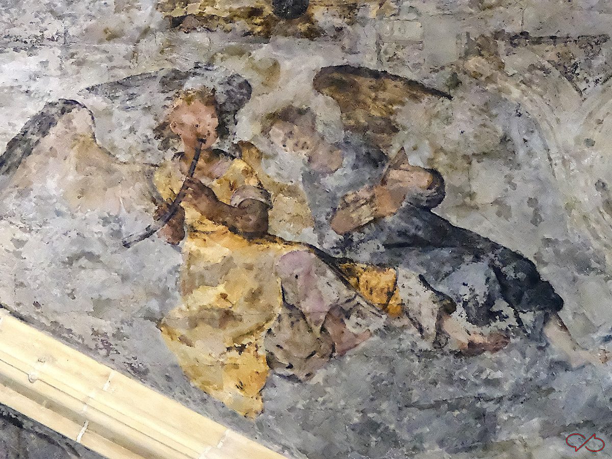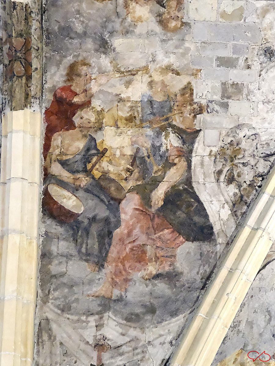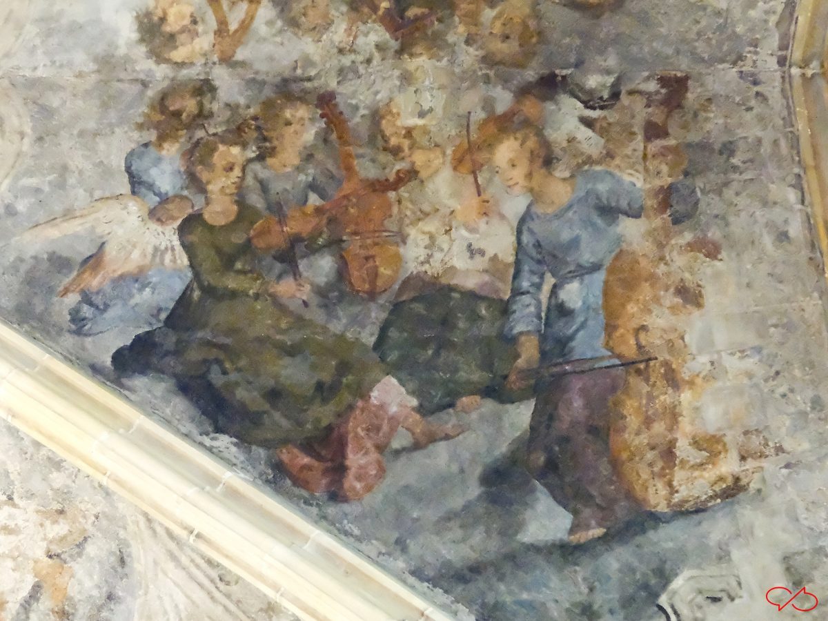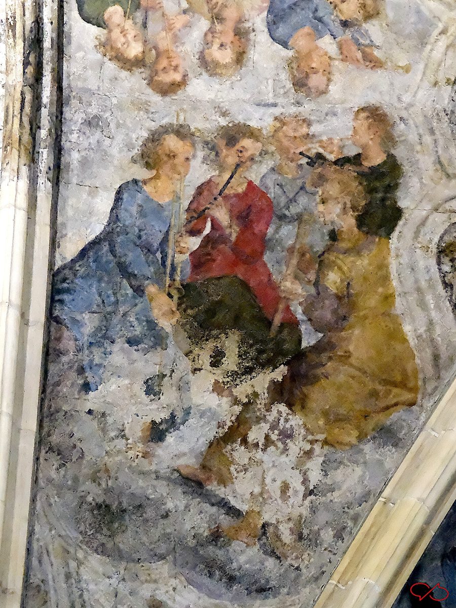 In het gewelf van de Dominicanenkerk zijn schilderingen te zien. In het midden zien we een aantal behoorlijk gedetailleerde. Het blijken musicerende engelen te zijn, keurig gegroepeerd naar soorten instrument. De schilderingen zijn in olieverf in 1618-19 gemaakt door monnik Jan Vasoens. Hier hebben vast Maastrichtenaren model voor gestaan. Het werk is nogal beschadigd, maar er zijn nog wat stukken die een heel aardig beeld geven van de levendigheid en de speelse schilderwijze. En mede door de beschadigingen doet het heel impressionistisch aan.