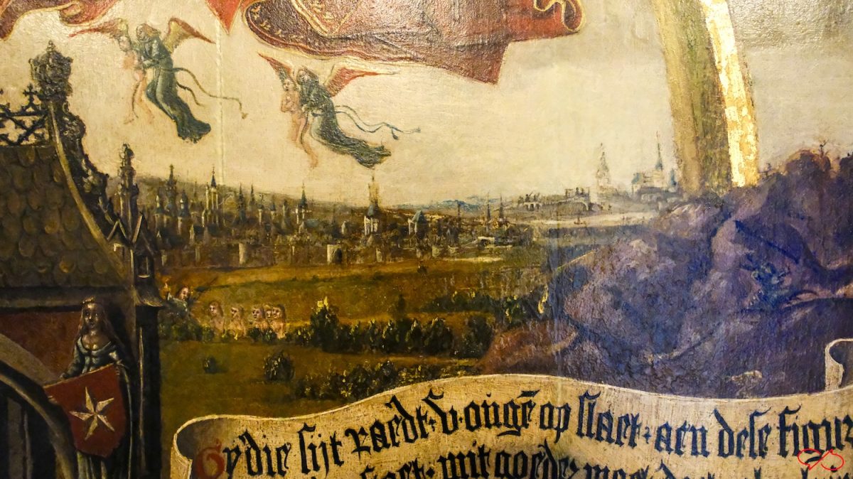 We zien op verschillende plaatsen verwijzingen naar Maastricht: de ster in de lijst, in de zuil, in het glas-in-lood en in het stadsgezicht. En er is er nog een, maar die verklap ik niet.