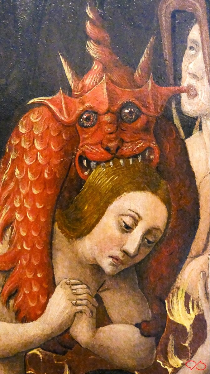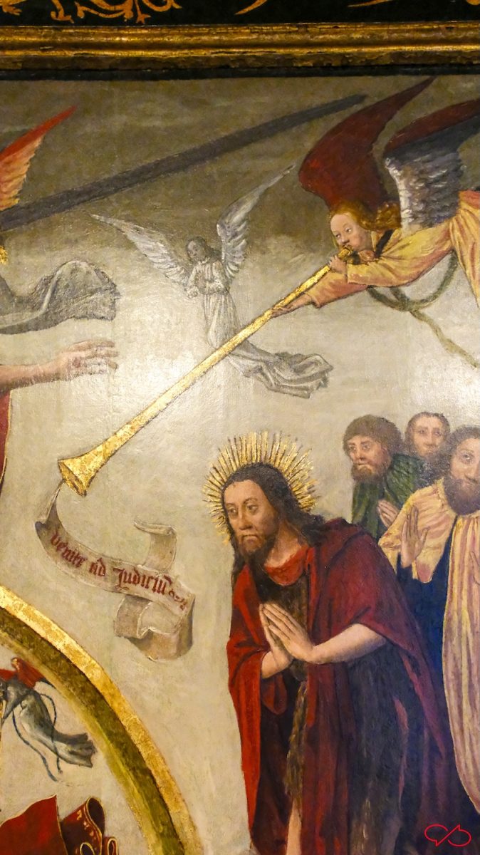 De details zijn zeer de moeite waard. Zie de engel met zijn bazuin, er komt een banderol uit met de tekst Venite ad judicium: Kom tot het oordeel. Of de duivel die zijn scherpe tanden in het hoofd van de zondares zet. Kijk eens naar de ogen van het Beest.