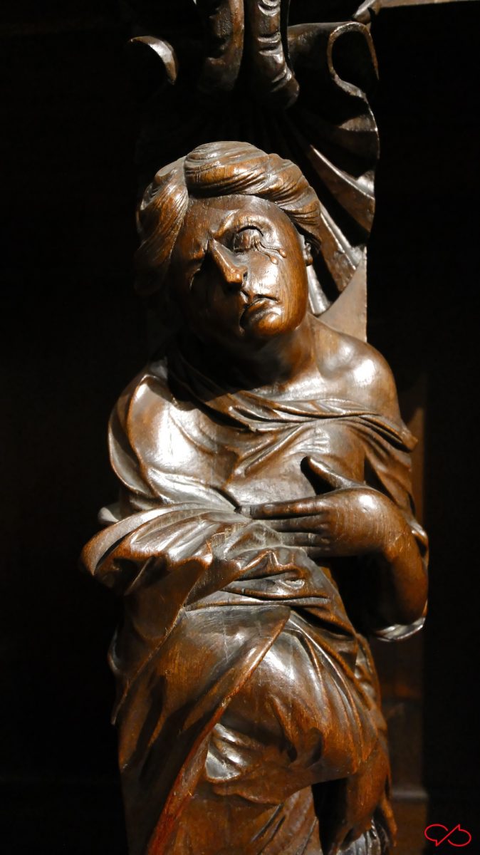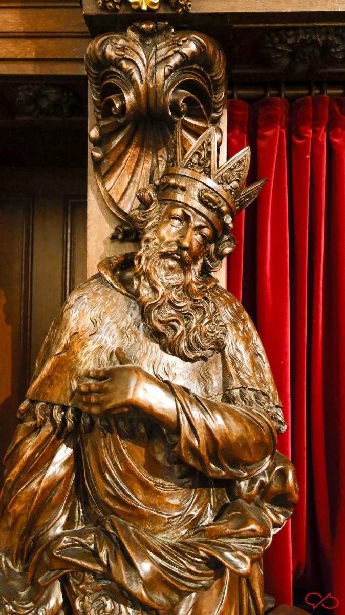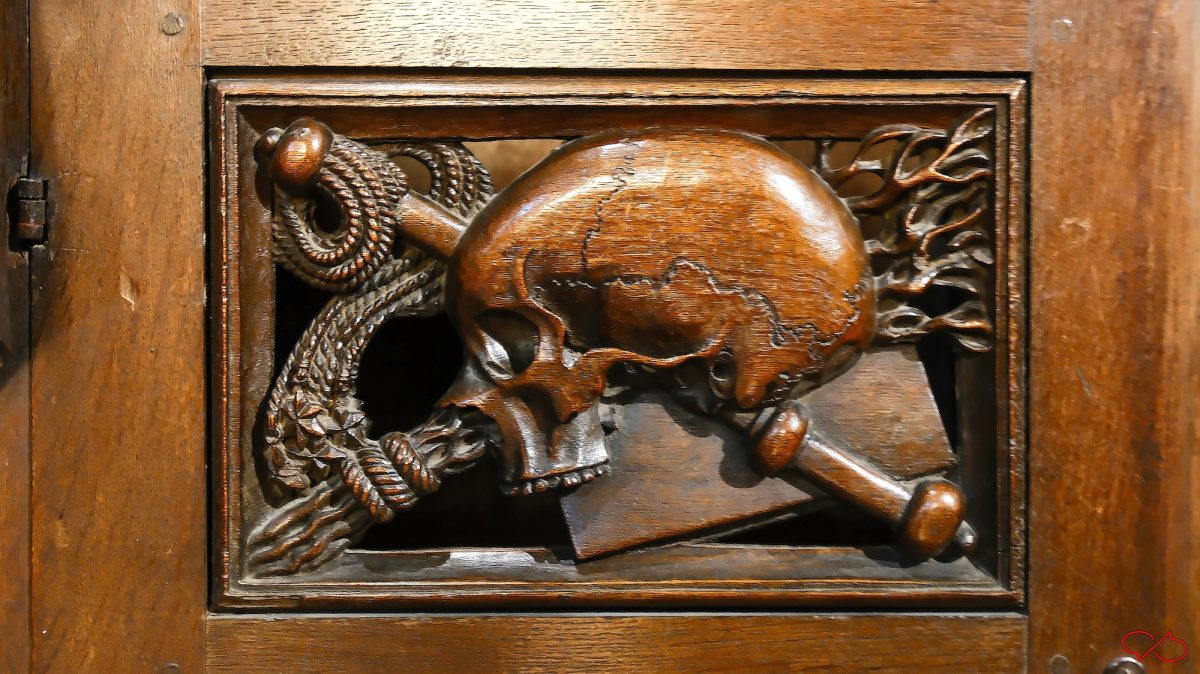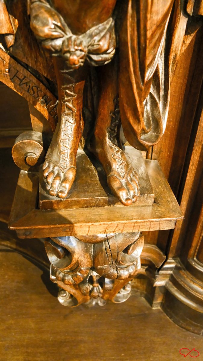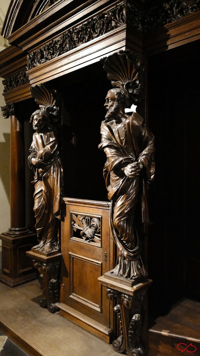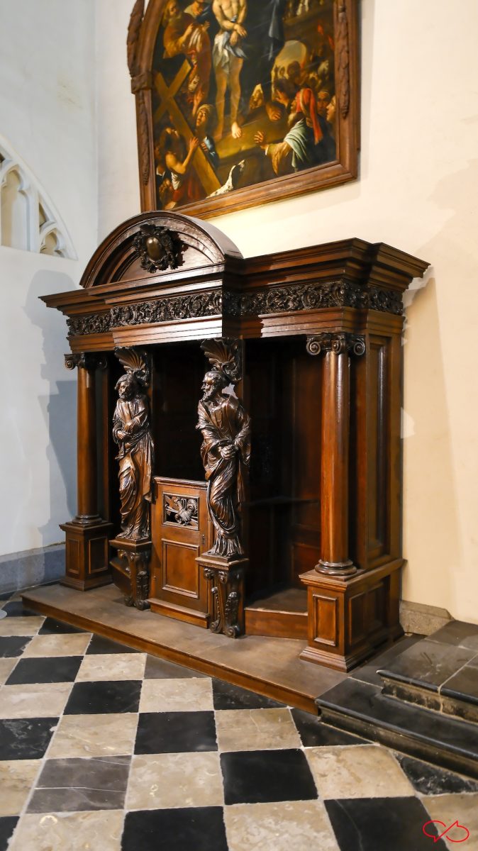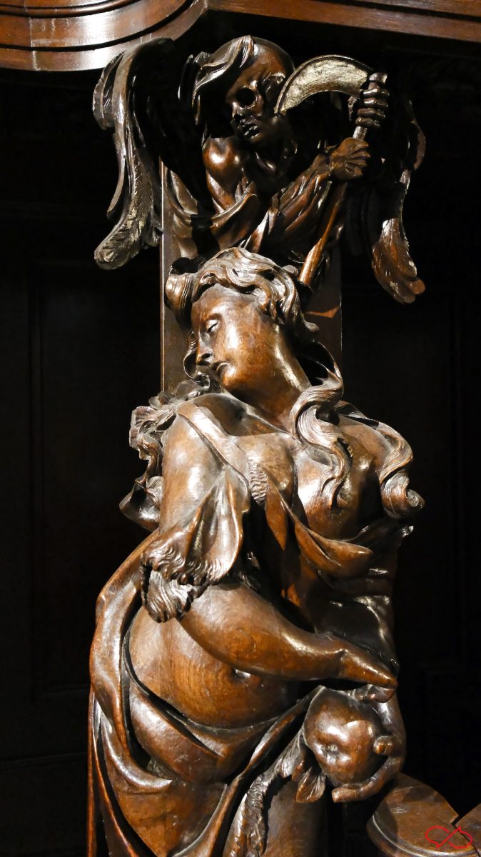 Iedere biechtstoel is versierd met twee grote beelden van bijbelse figuren en heiligen. De uitbeeldingen hebben natuurlijk allemaal met zonden te maken. Zo zien we een wulpse Eva, ze heeft de appel in haar hand. Maar haar rondingen zijn niets dan ijdelheid, de man met de zeis zweeft al boven haar: memento mori. En een vrouw met tenhemelschreiend droevig hartzeer. Ook de koning ontkomt er niet aan. Kijk eens naar zijn kroon en z’n hermelijnen mantel: hij zal het achter moeten laten als hij voor de hoogste rechter staat. ’t Letste jèske heet gein tèske…