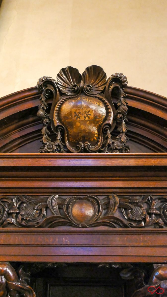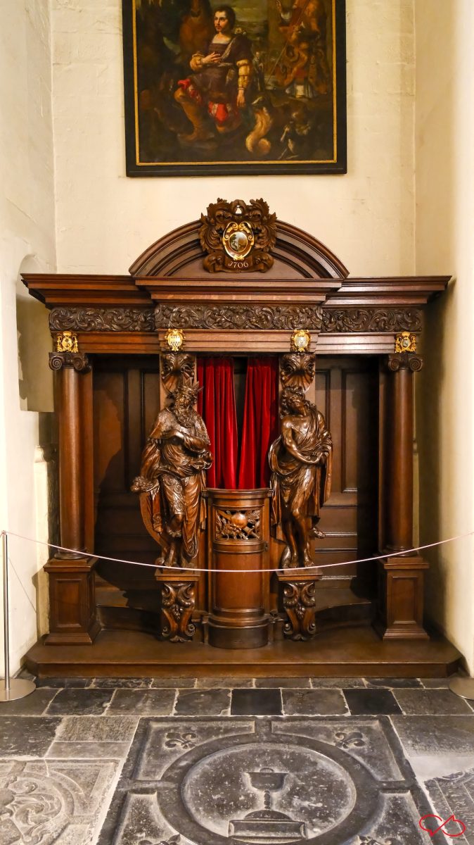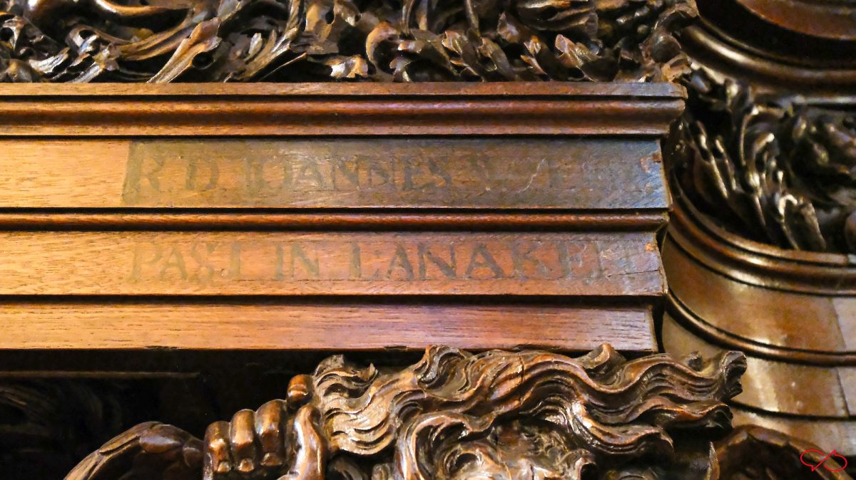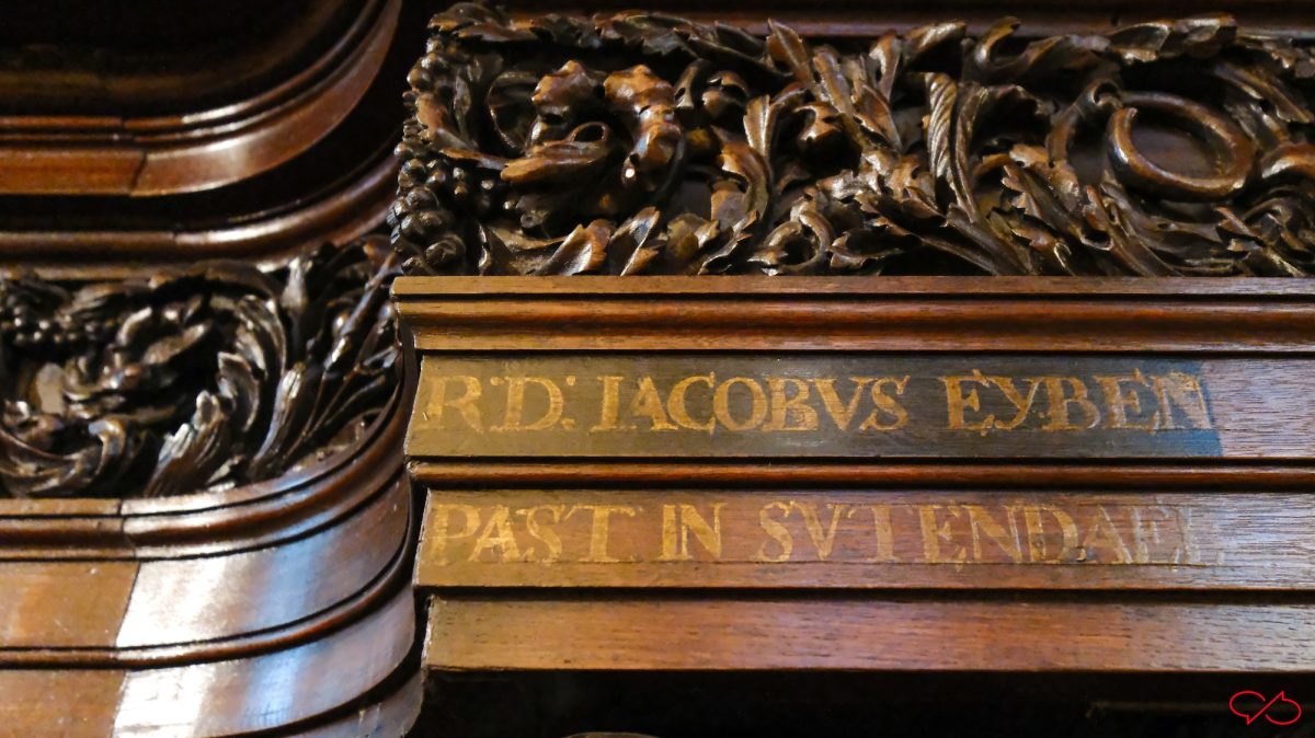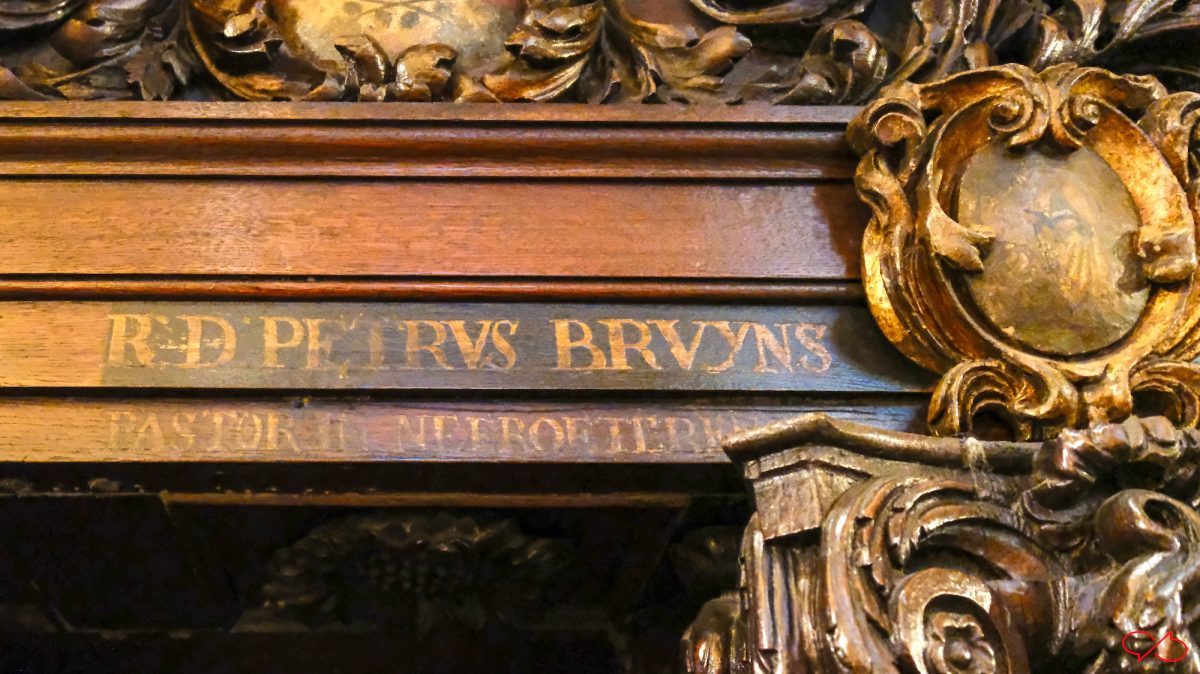 En wat heel bijzonder is: teksten. Met namen. Van pastoors van dorpen ten westen van Maastricht. We zien ondermeer R.D. Iacobvs Eyben, past in Svtendael, R.D. Ioannes Wylens(?), past. in Lanaken en R.D. Petrvs Brvyns, pastor in Neeroeteren. Ook bovenin de bekroning zitten namen en wapenschilden. Aangezien de biechtstoelen voor de dominicanen waren gemaakt, waren deze geestelijken misschien ook dominicanen. Misschien hadden ze financieel wel bijgedragen aan de bouw in ruil voor deze vermelding.