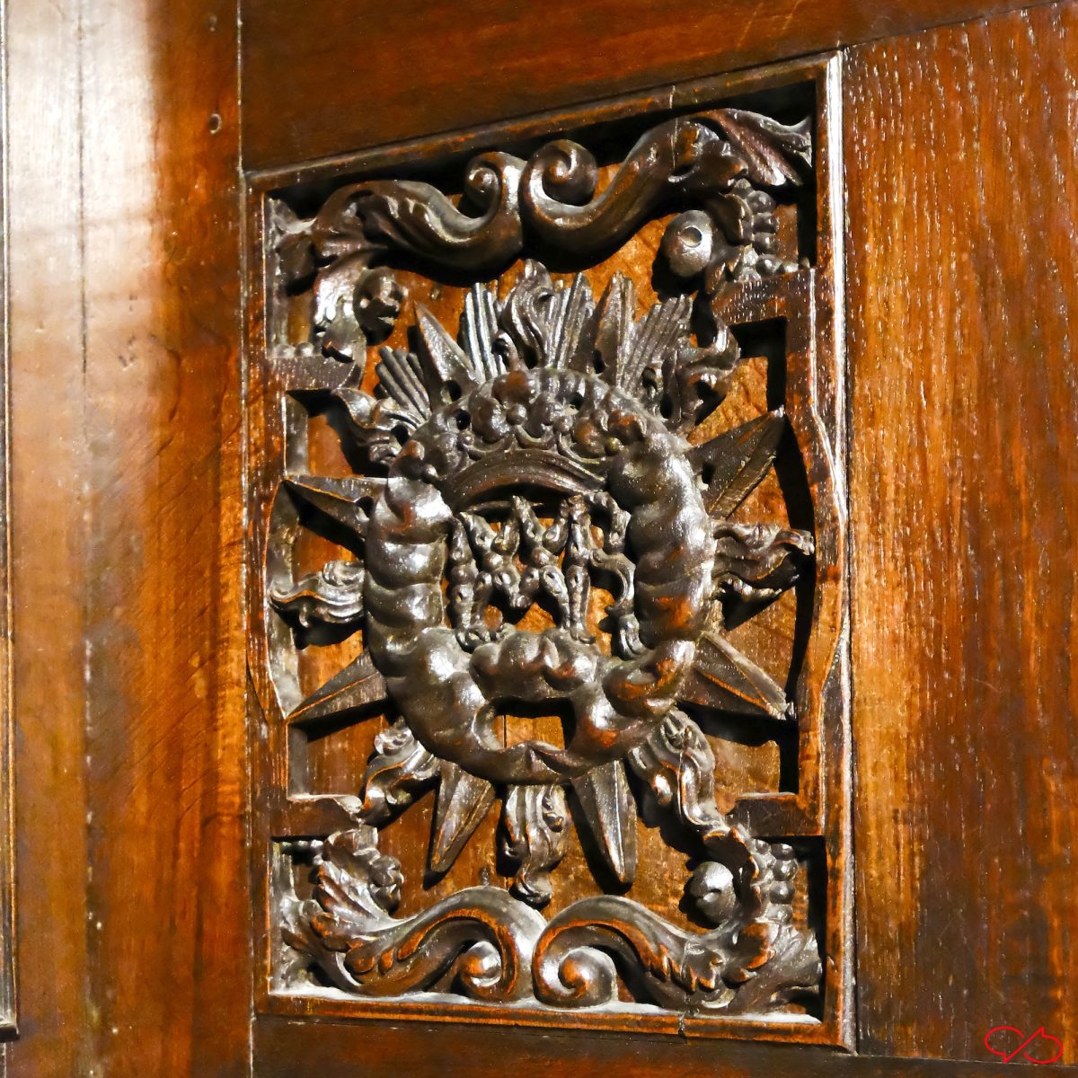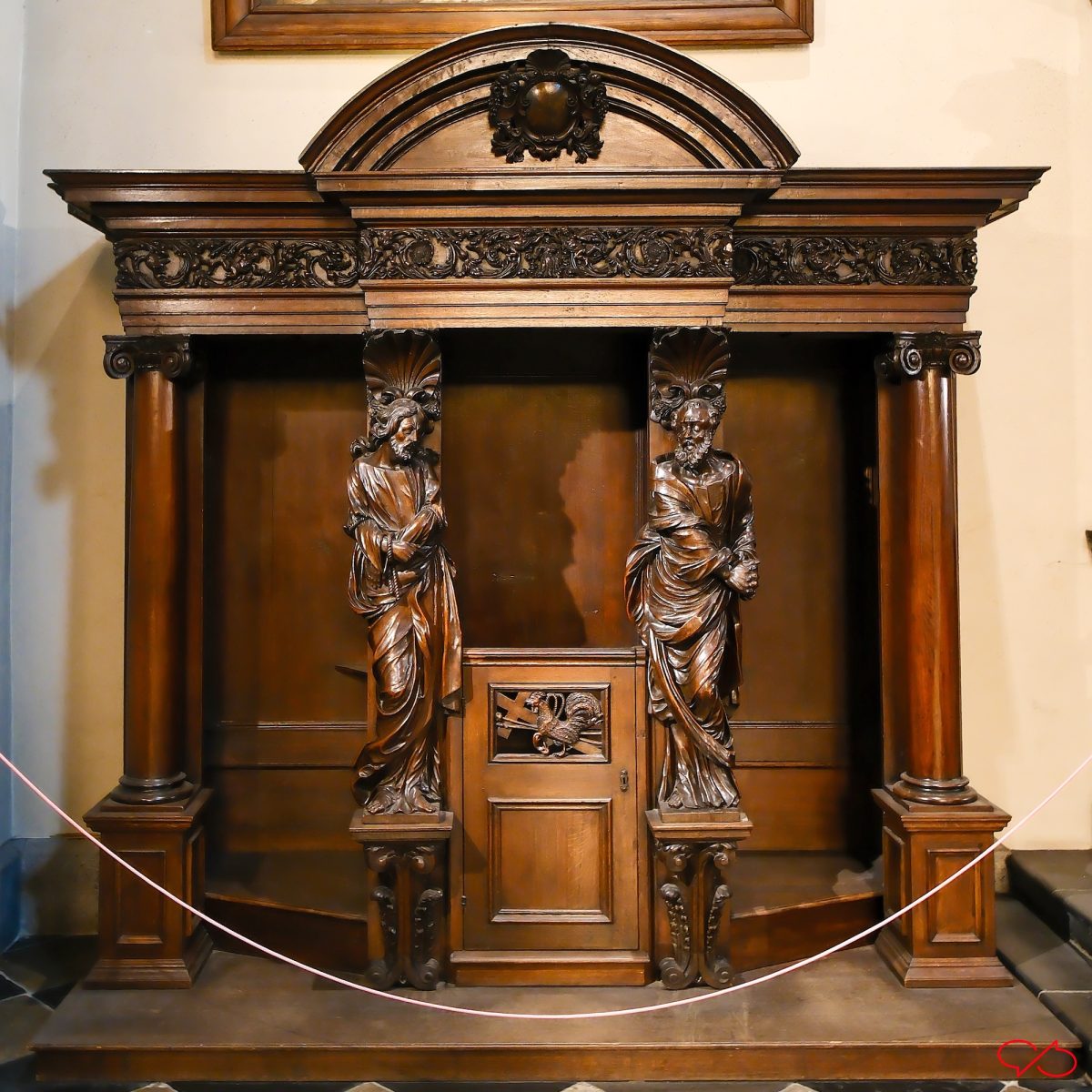 In de deurtjes van het middenstuk, dat voor de priester, zitten houtsnijwerkjes die strafwerktuigen uitbeelden. Zie de kat-met-negen-staarten en de roe.