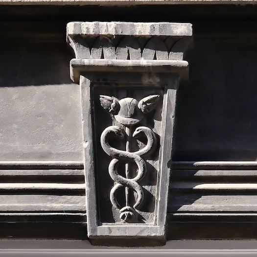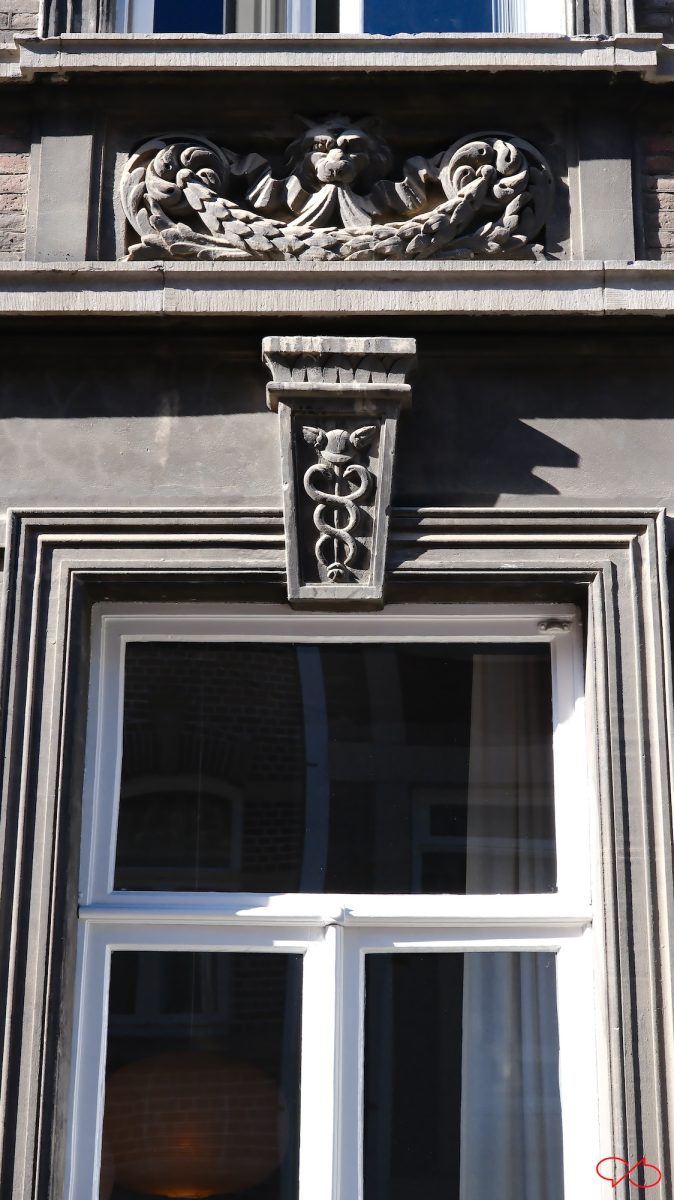 Boven de ramen zit een taps toelopend blok. Het lijkt op een versierde sluitsteen van een boog, een agraffe. Maar er is geen boog. Het is dus alleen ter versiering. De versiering is een staf van Hermes, een caduceus. De staf is bekroond met twee vleugels en met twee slangen er omheen. Het is het symbool van handel. Het pand was dus misschien een handelshuis.