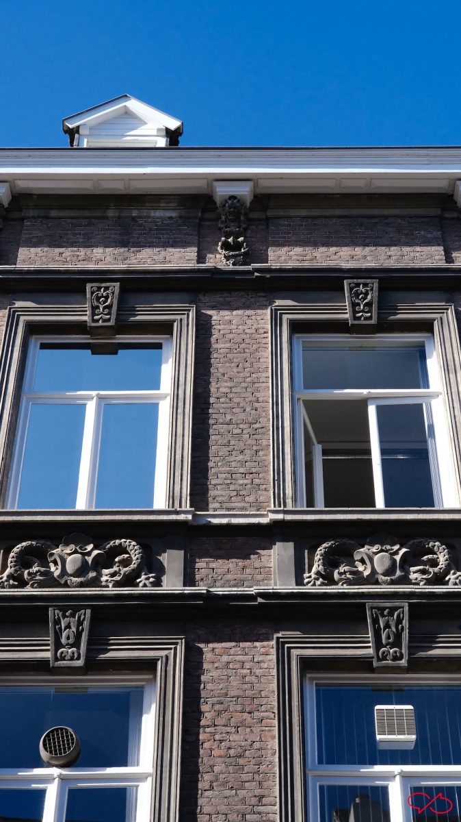 Boven de agraffe een steen met in het midden een leeuwenkop en eronder een krans van bladeren en ander loofwerk. Zulke versieringen zien we ook bij de etages daarboven: de rijkdom spat ervan af.