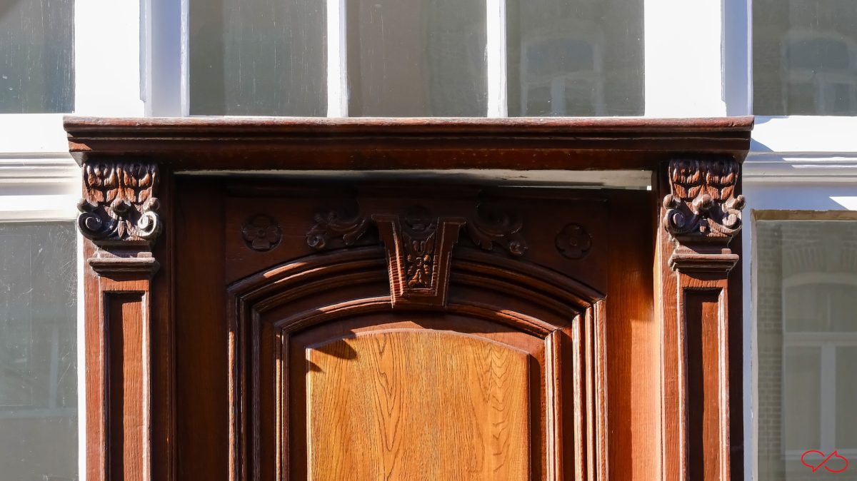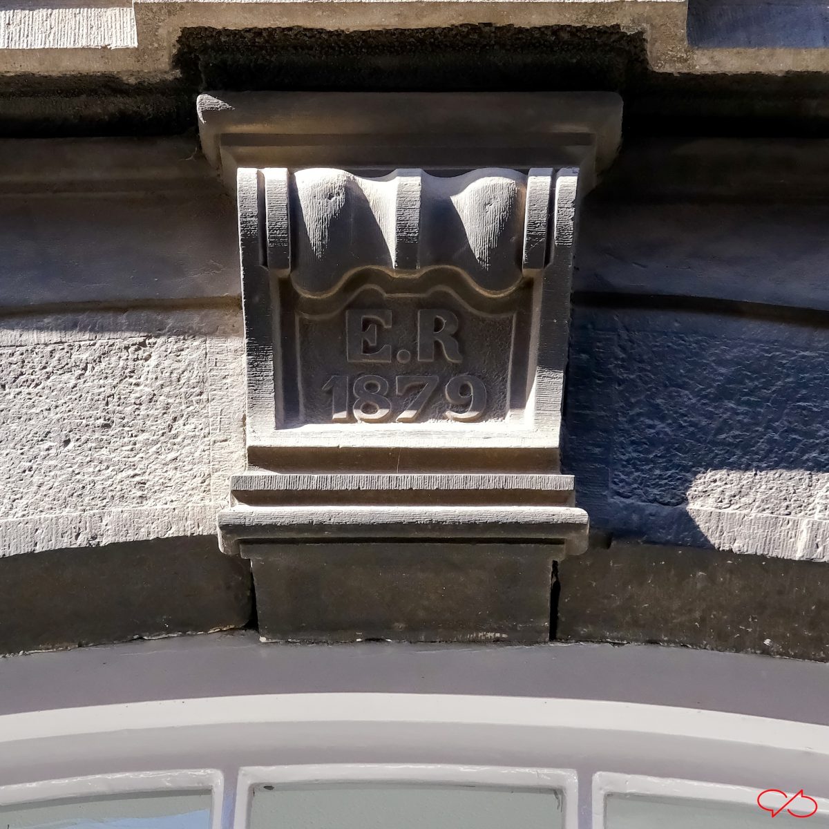 Naast de deur twee halfzuilen met als bekroning kapiteeltjes. En in de deur ook wat versiering. En boven de deur een sluitsteen. Deze zit wel in een boog. Het gebouw is van 1879. En E.R is een lid van de familie Regout. Dat verklaart de patriciërswoning en de symbolen van de handel.