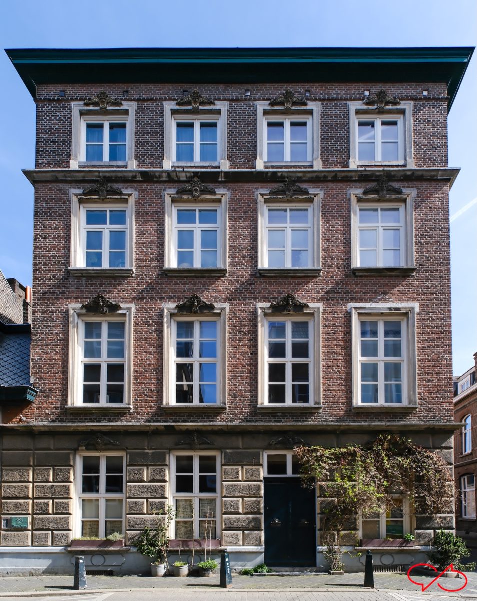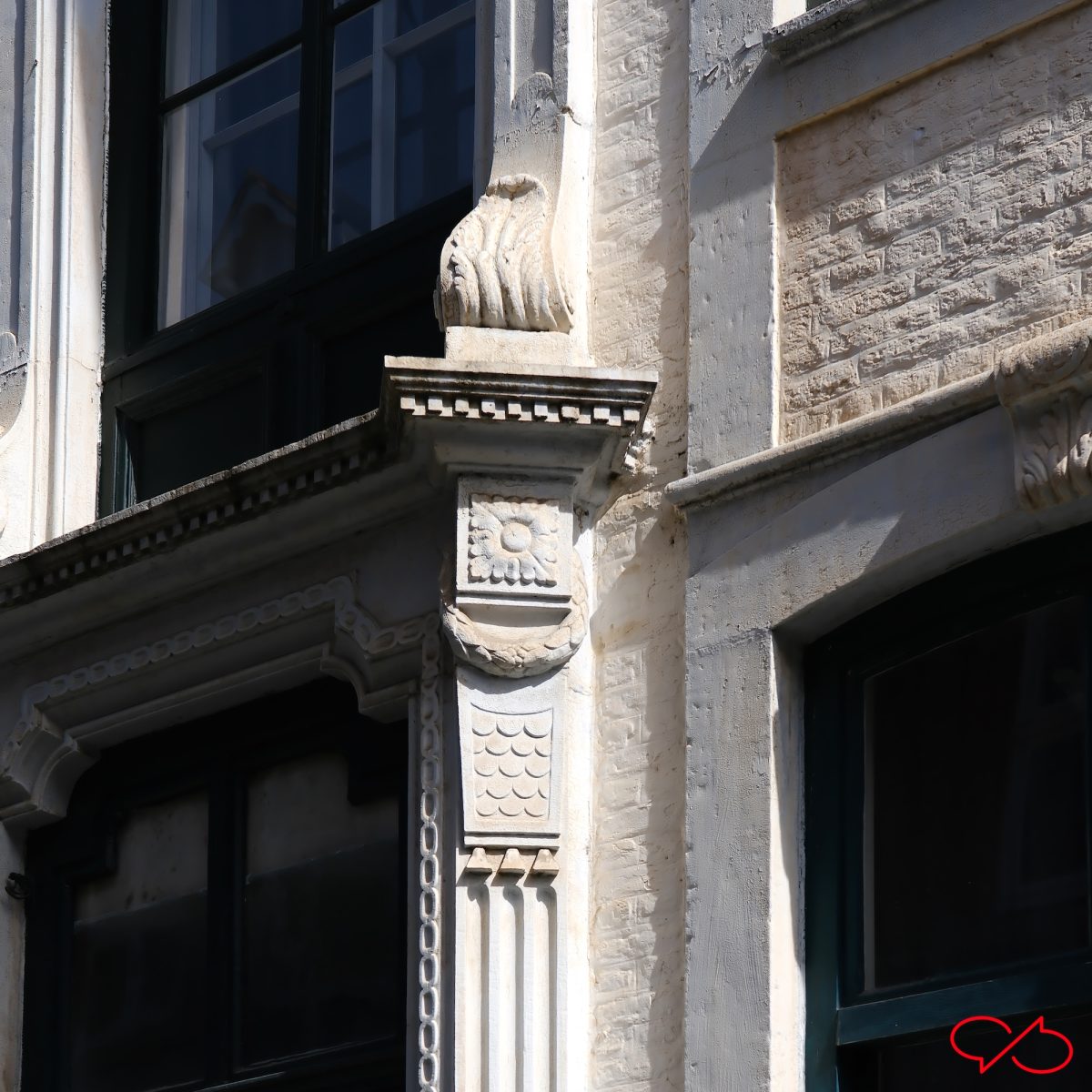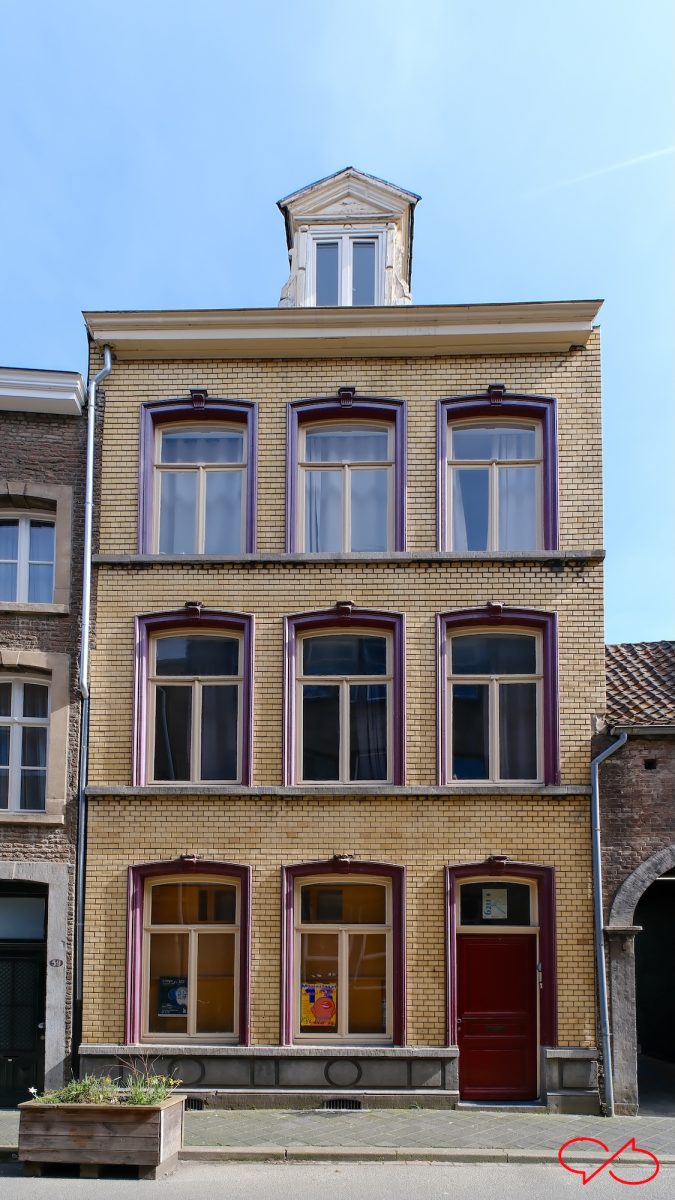 Dan pand 61 in de opmerkelijk kleuren. De voegen tussen de stenen liggen iets naar terug, waardoor de steen iets naar voren lijkt te komen. De paarse omlijsting van de ramen contrasteert mooi. Het was oorspronkelijk grijze natuursteen.