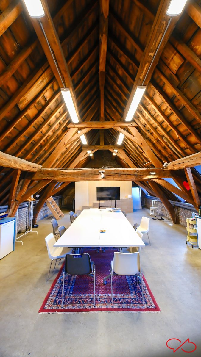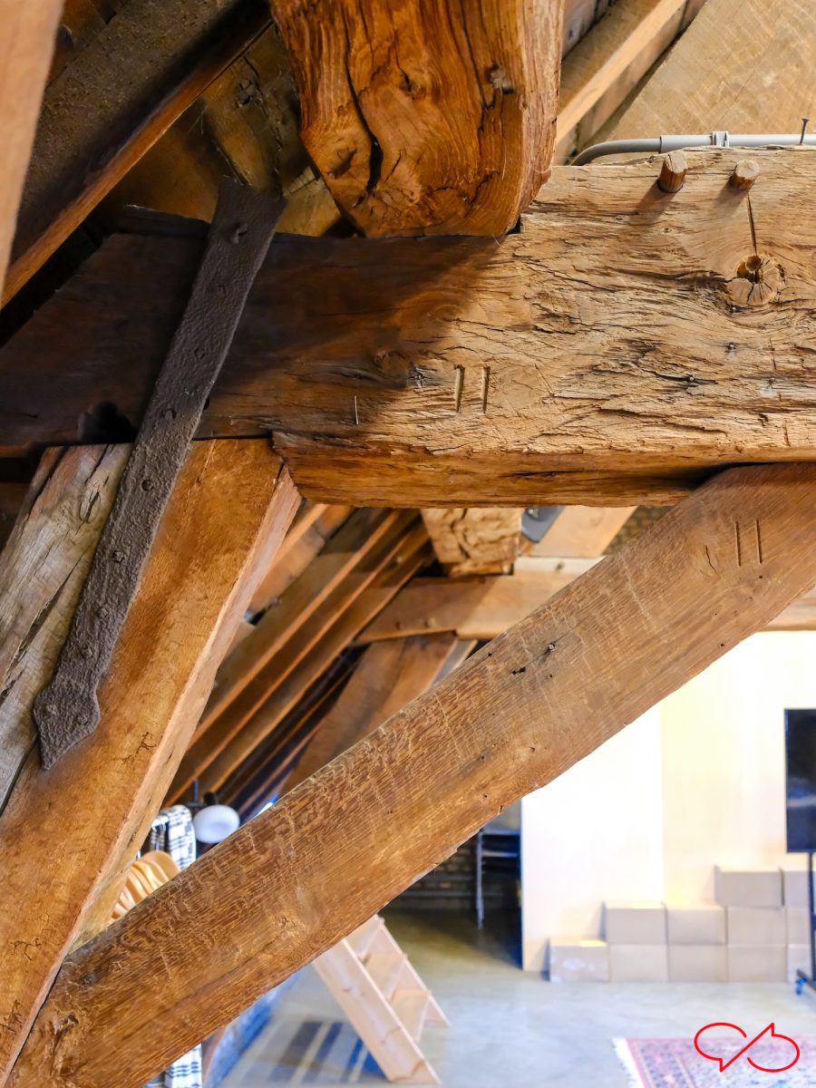 De zolder heeft een markante kapconstructie. Als je naar de voorste balken kijkt, zie je hoe Gustav Eiffel tot zijn toren is gekomen. Op de detailfoto zie je een ijzeren strip, merktekens II op de horizontale balk en de schoor en houten toognagels, de pennen waarmee de verbinding is vastgezet.