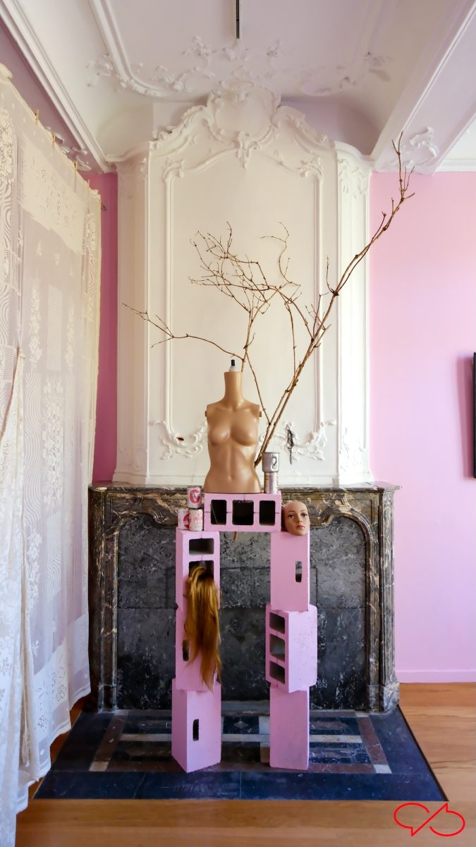 Er is nog één schouw over. Met een marmeren schoorsteenmantel. Kijk eens hoe het stucwerk van muur overgaat in plafond. En het natuursteen doorloopt in de vloer. In het midden van de mantel deze fraaie versiering. In andere kamers zijn de schouwen ooit opgeofferd aan de vooruitgang.