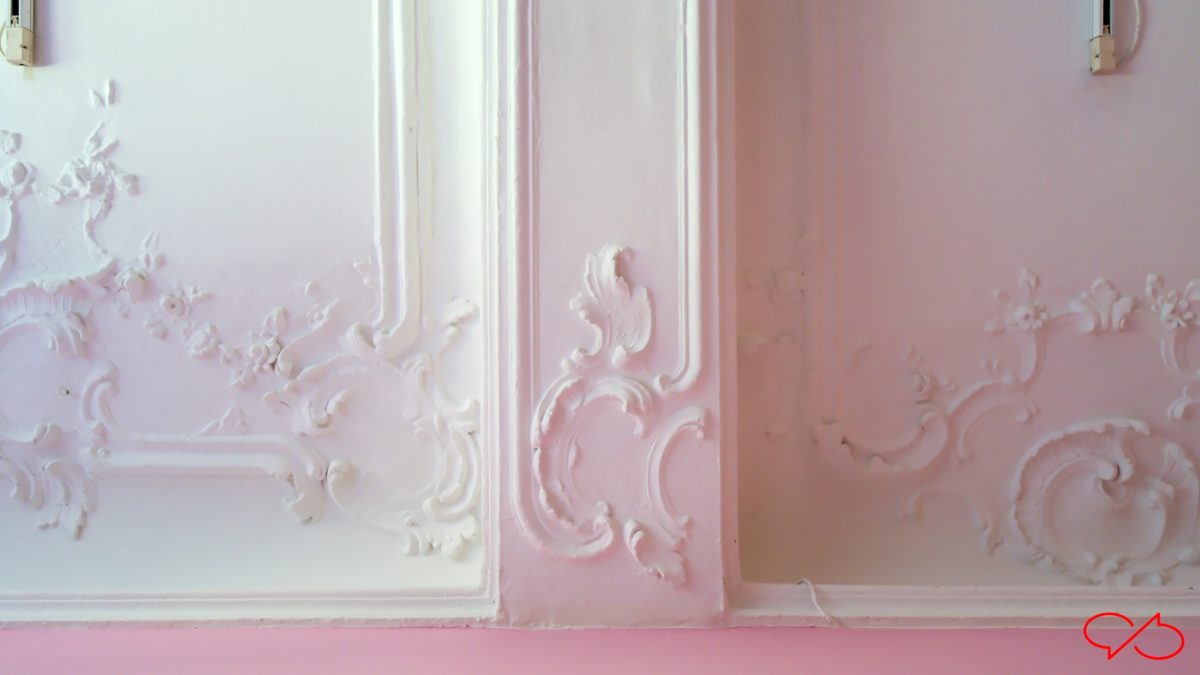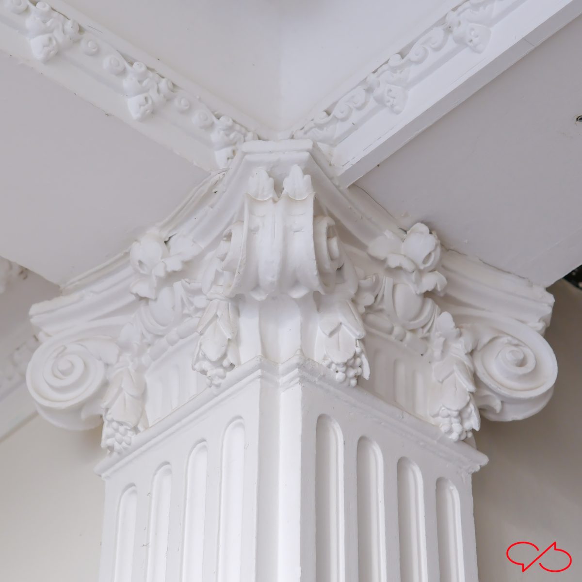 Maar aan de plafonds zien we nog wel het gedetailleerde stucwerk. Een beetje dichtgeschilderd, dat wel, maar nog duidelijk herkenbaar. En goed geconserveerd door de lagen verf.