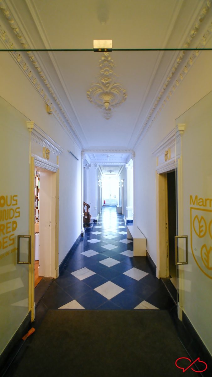 We gaan naar binnen. Er is een lange hal met aan weerszijden deuren naar verschillende kamers. In het midden van de hal is een viersprong. Op de hoeken van dat middenstuk staan pilasters met cannelures, de verticale groeven. De korintische kapitelen bestaan uit voluten en loofwerk.