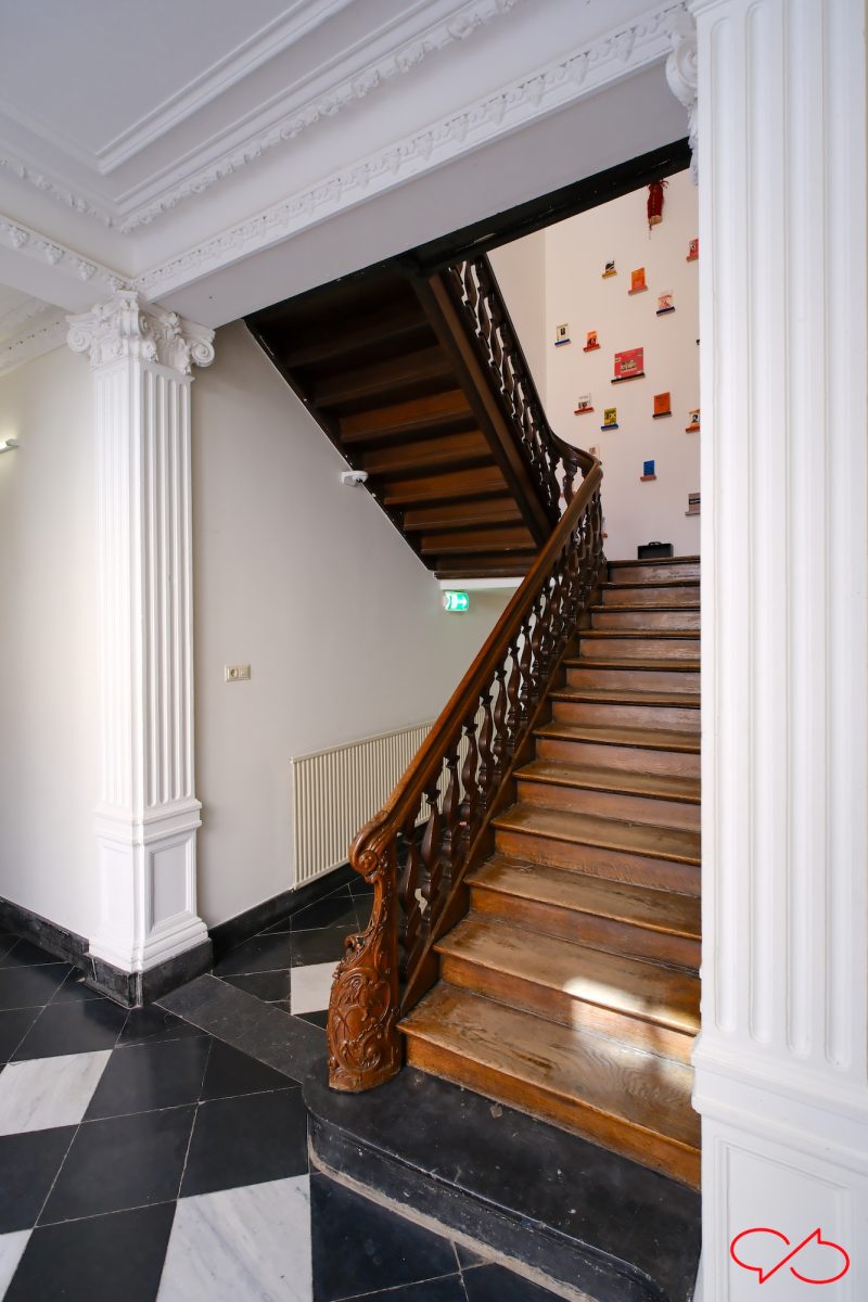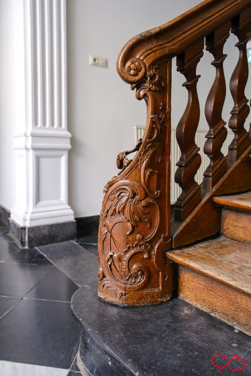 Het is de plek van de trap. Het is er weer zo een met een hardstenen bloktrede. Met een prachtig versierde onderste baluster.